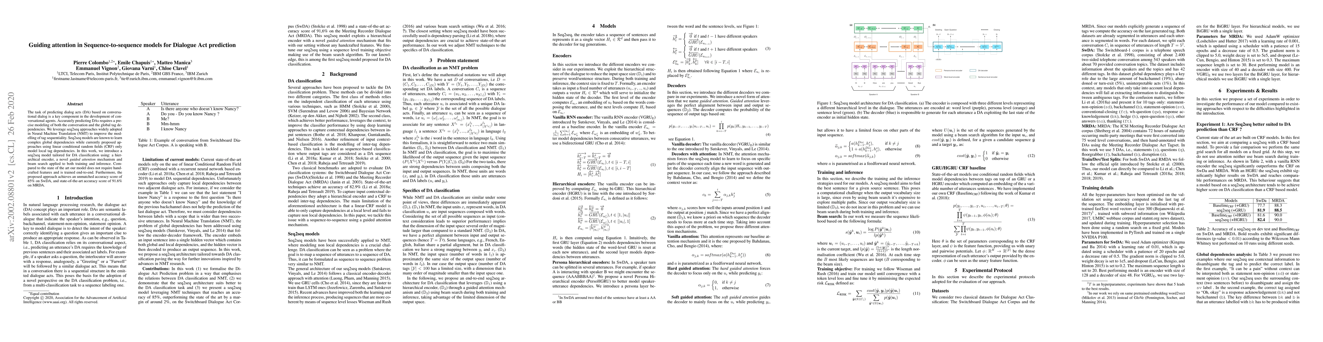 The task of predicting dialog acts (DA) based on conversational dialog is a key component in the development of conversational agents. Accurately predicting DAs requires a precise modeling of both the conversation and the global tag dependencies. We leverage seq2seq approaches widely adopted in Neural Machine Translation (NMT) to improve the modelling of tag sequentiality. Seq2seq models are known to learn complex global dependencies while currently proposed approaches using linear conditional random fields (CRF) only model local tag dependencies. In this work, we introduce a seq2seq model tailored for DA classification using: a hierarchical encoder, a novel guided attention mechanism and beam search applied to both training and inference. Compared to the state of the art our model does not require handcrafted features and is trained end-to-end. Furthermore, the proposed approach achieves an unmatched accuracy score of 85% on SwDA, and state-of-the-art accuracy score of 91.6% on MRDA.