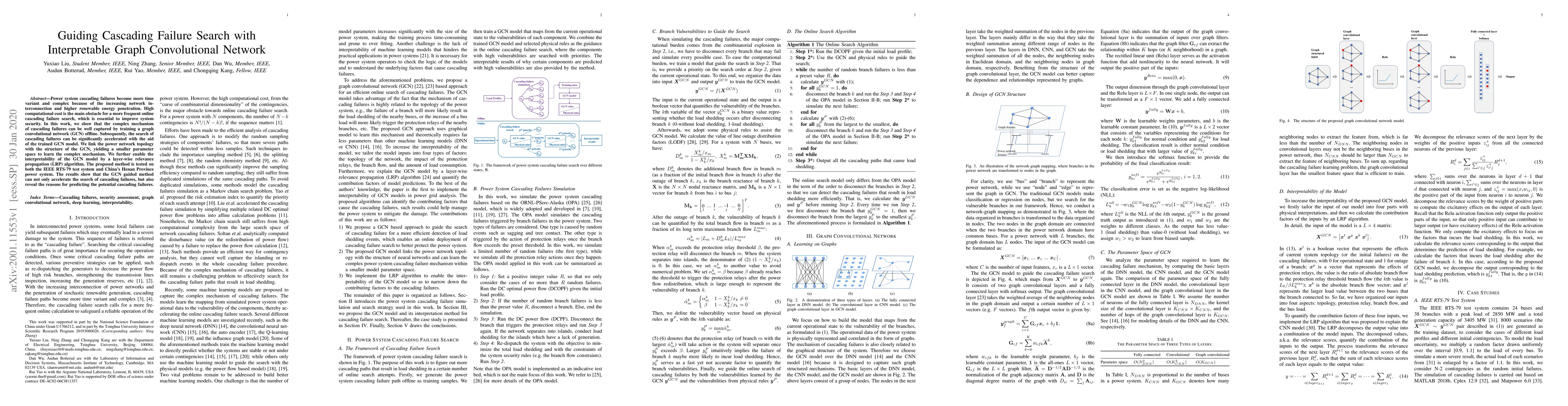 Power system cascading failures become more time variant and complex because of the increasing network interconnection and higher renewable energy penetration. High computational cost is the main obstacle for a more frequent online cascading failure search, which is essential to improve system security. In this work, we show that the complex mechanism of cascading failures can be well captured by training a graph convolutional network (GCN) offline. Subsequently, the search of cascading failures can be significantly accelerated with the aid of the trained GCN model. We link the power network topology with the structure of the GCN, yielding a smaller parameter space to learn the complex mechanism. We further enable the interpretability of the GCN model by a layer-wise relevance propagation (LRP) algorithm. The proposed method is tested on both the IEEE RTS-79 test system and China's Henan Province power system. The results show that the GCN guided method can not only accelerate the search of cascading failures, but also reveal the reasons for predicting the potential cascading failures.