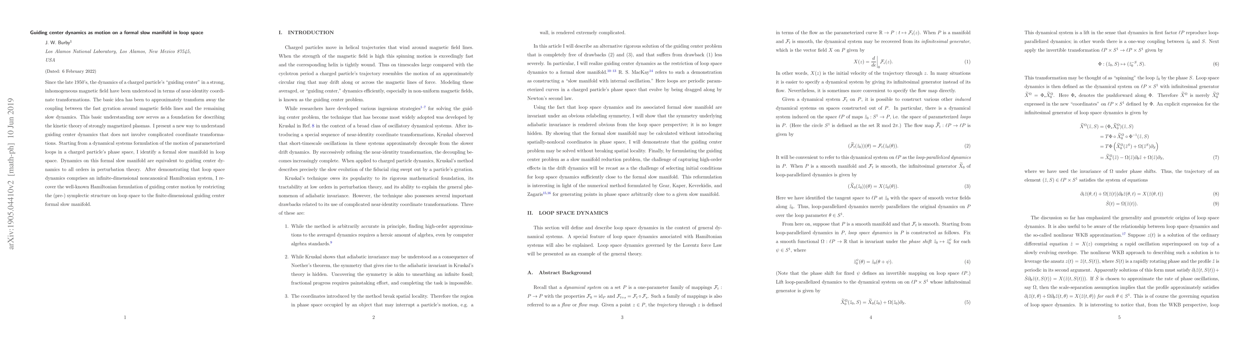 Since the late 1950's, the dynamics of a charged particle's ``guiding center" in a strong, inhomogeneous magnetic field have been understood in terms of near-identity coordinate transformations. The basic idea has been to approximately transform away the coupling between the fast gyration around magnetic fields lines and the remaining slow dynamics. This basic understanding now serves as a foundation for describing the kinetic theory of strongly magnetized plasmas. I present a new way to understand guiding center dynamics that does not involve complicated coordinate transformations. Starting from a dynamical systems formulation of the motion of parameterized loops in a charged particle's phase space, I identify a formal slow manifold in loop space. Dynamics on this formal slow manifold are equivalent to guiding center dynamics to all orders in perturbation theory. After demonstrating that loop space dynamics comprises an infinite-dimensional noncanonical Hamiltonian system, I recover the well-known Hamiltonian formulation of guiding center motion by restricting the (pre-) symplectic structure on loop space to the finite-dimensional guiding center formal slow manifold.