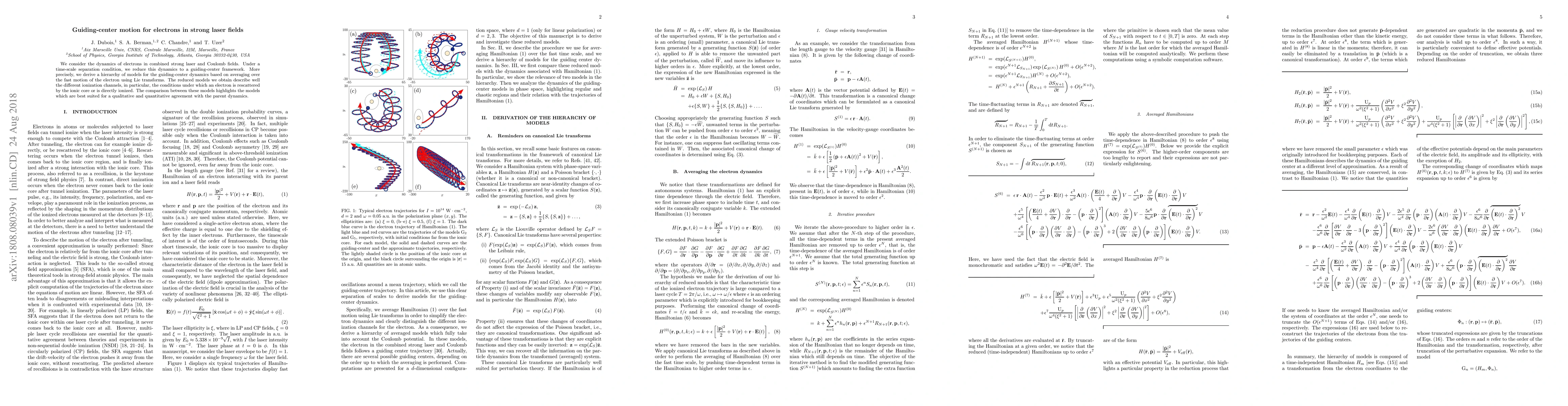 We consider the dynamics of electrons in combined strong laser and Coulomb fields. Under a timescale separation condition, we reduce this dynamics to a guiding-center framework. More precisely, we derive a hierarchy of models for the guiding-center dynamics based on averaging over the fast motion of the electron using Lie transforms. The reduced models we obtain describe well the different ionization channels, in particular, the conditions under which an electron is rescattered by the ionic core or is directly ionized. The comparison between these models highlights the models which are best suited for a qualitative and quantitative agreement with the parent dynamics.