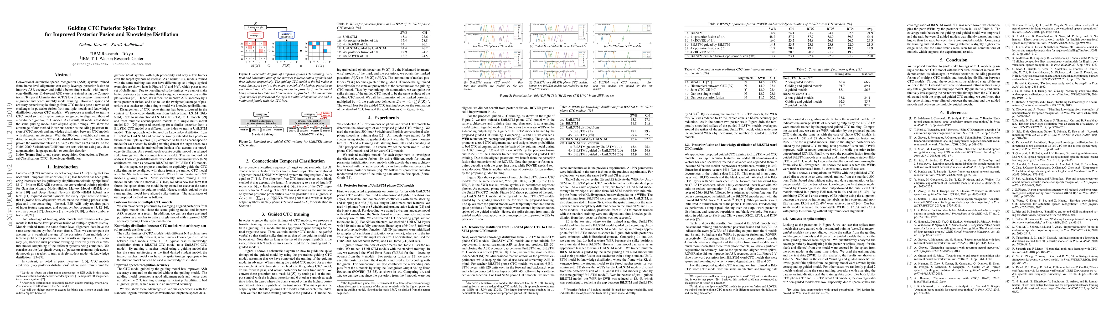 This paper proposes a method to guide the posterior spike timings of CTC models to align with those of a pre-trained guiding CTC model, improving posterior fusion and knowledge distillation. The approach results in better word error rate reductions in a single word CTC model distilled from multiple models on the Switchboard dataset.