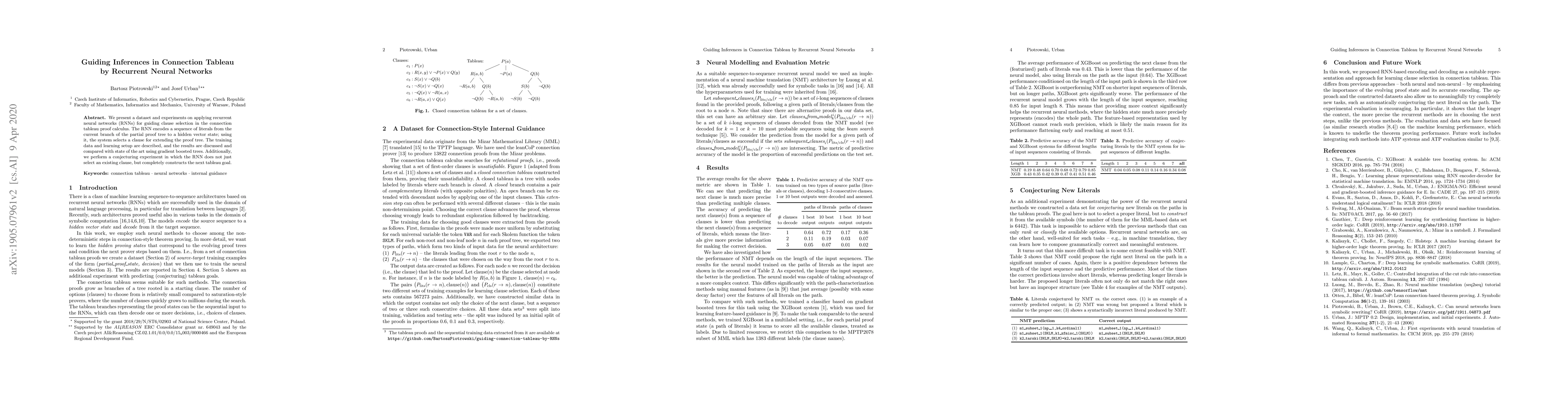 We present a dataset and experiments on applying recurrent neural networks (RNNs) for guiding clause selection in the connection tableau proof calculus. The RNN encodes a sequence of literals from the current branch of the partial proof tree to a hidden vector state; using it, the system selects a clause for extending the proof tree. The training data and learning setup are described, and the results are discussed and compared with state of the art using gradient boosted trees. Additionally, we perform a conjecturing experiment in which the RNN does not just select an existing clause, but completely constructs the next tableau goal.