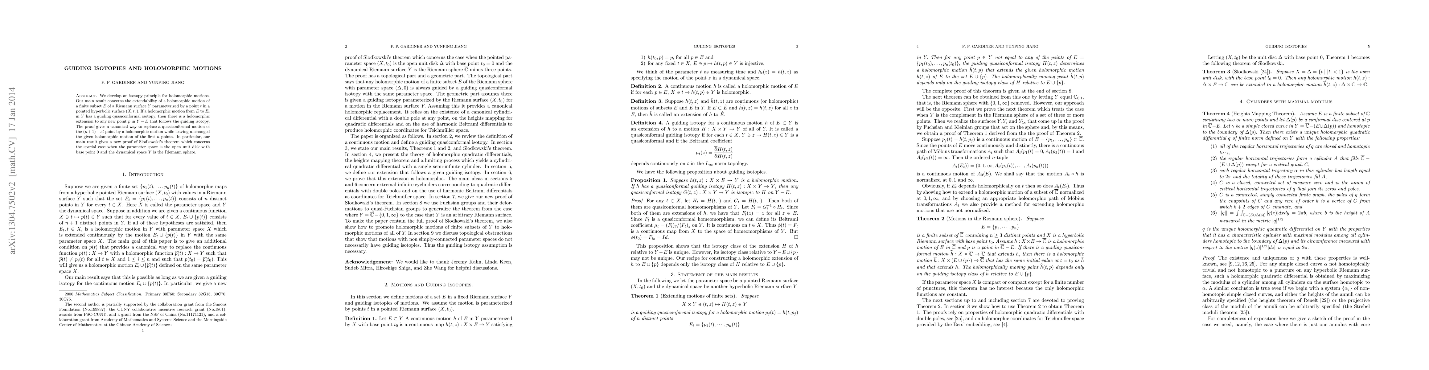 We develop an isotopy principle for holomorphic motions. Our main result concerns the extendability of a holomorphic motion of a finite subset $E$ of a Riemann surface $Y$ parameterized by a point $t$ in a pointed hyperbolic surface $(X, t_{0})$. If a holomorphic motion from $E$ to $E_{t}$ in $Y$ has a guiding quasiconformal isotopy, then there is a holomorphic extension to any new point $p$ in $Y-E$ that follows the guiding isotopy. The proof gives a canonical way to replace a quasiconformal motion of the $(n+1)^{th}$ point by a holomorphic motion while leaving unchanged the given holomorphic motion of the first $n$ points. In particular, our main result gives a new proof of Slodkowski's theorem which concerns the special case when the parameter space is the open unit disk with base point $0$ and the dynamical space $Y$ is the Riemann sphere.
