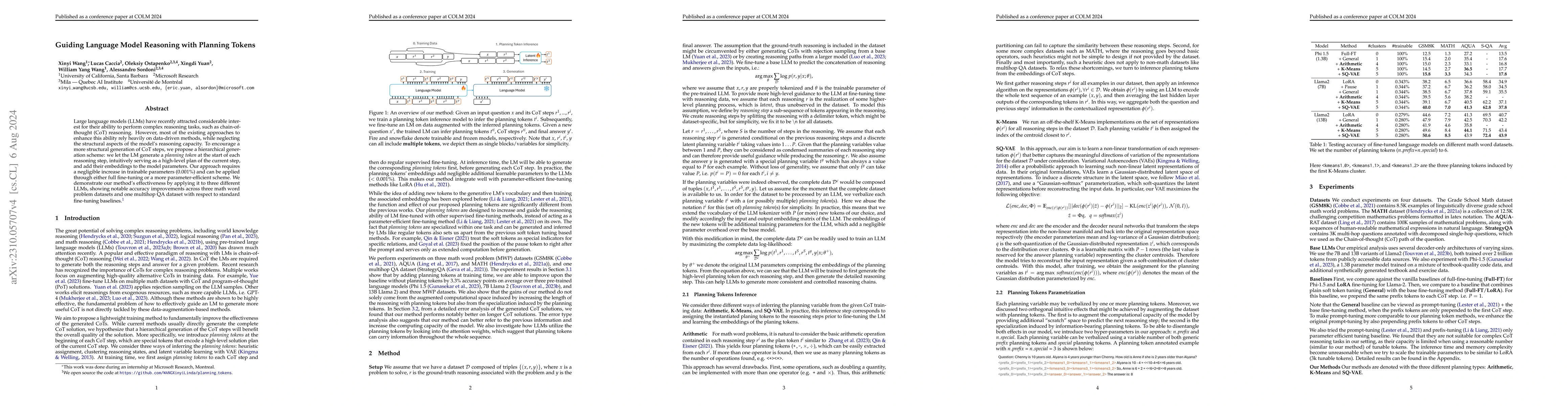 This paper proposes using planning tokens to guide large language models in math reasoning, addressing their inconsistency across reasoning chains. The method involves minimal parameter increase and shows significant accuracy improvements on three math word problem datasets compared to standard fine-tuning.
