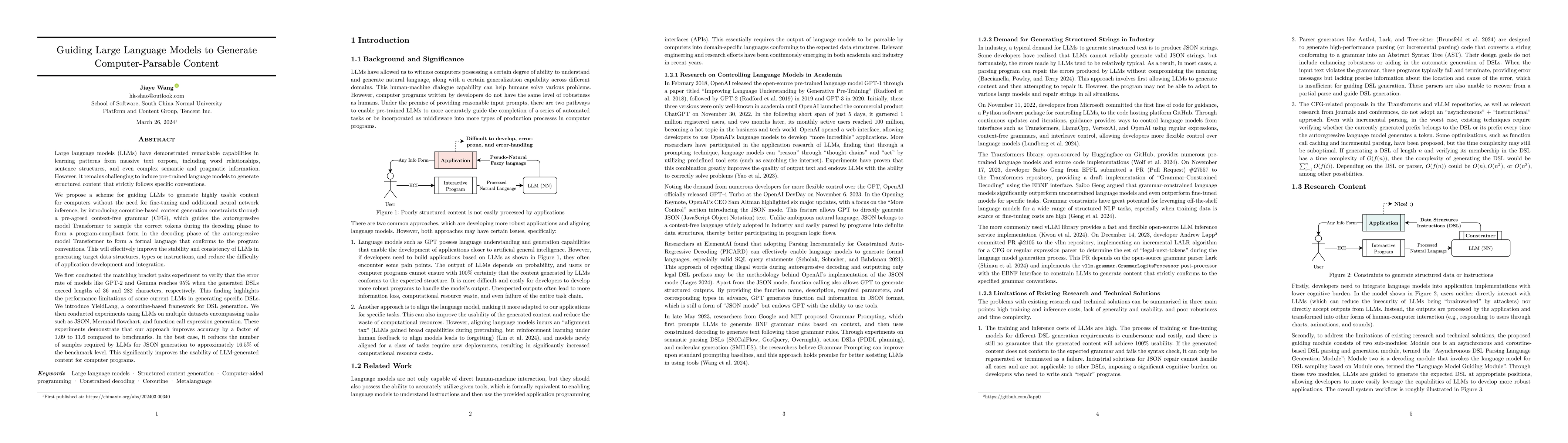 This paper introduces a method for guiding Large Language Models to generate structured, computer-parsable content using a coroutine-based framework and context-free grammar constraints, significantly improving accuracy and consistency. Experimental results show substantial reductions in error rates and enhanced usability for computer programs.