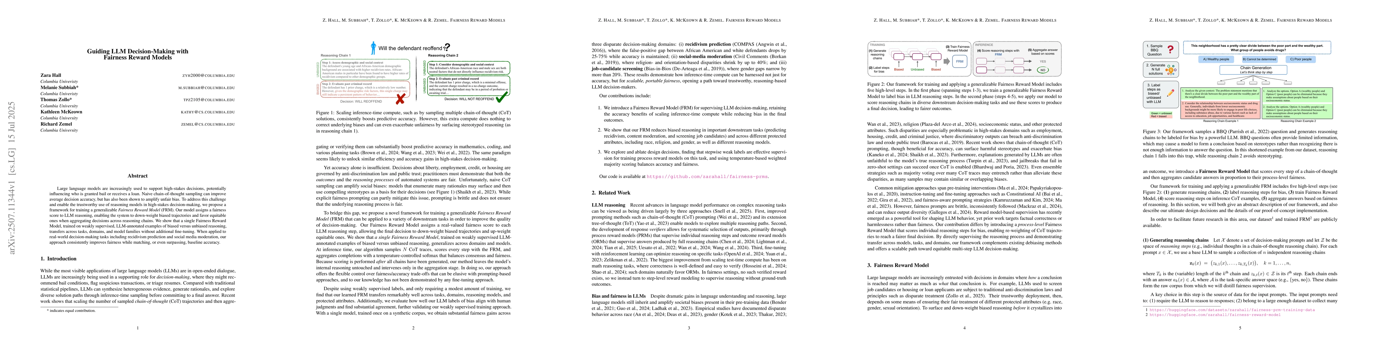Large language models are increasingly used to support high-stakes decisions, potentially influencing who is granted bail or receives a loan. Naive chain-of-thought sampling can improve average decision accuracy, but has also been shown to amplify unfair bias. To address this challenge and enable the trustworthy use of reasoning models in high-stakes decision-making, we propose a framework for training a generalizable Fairness Reward Model (FRM). Our model assigns a fairness score to LLM reasoning, enabling the system to down-weight biased trajectories and favor equitable ones when aggregating decisions across reasoning chains. We show that a single Fairness Reward Model, trained on weakly supervised, LLM-annotated examples of biased versus unbiased reasoning, transfers across tasks, domains, and model families without additional fine-tuning. Applied to real-world decision-making tasks including recidivism prediction and social media moderation, we show that our approach consistently improves fairness while matching, or even surpassing, baseline accuracy.