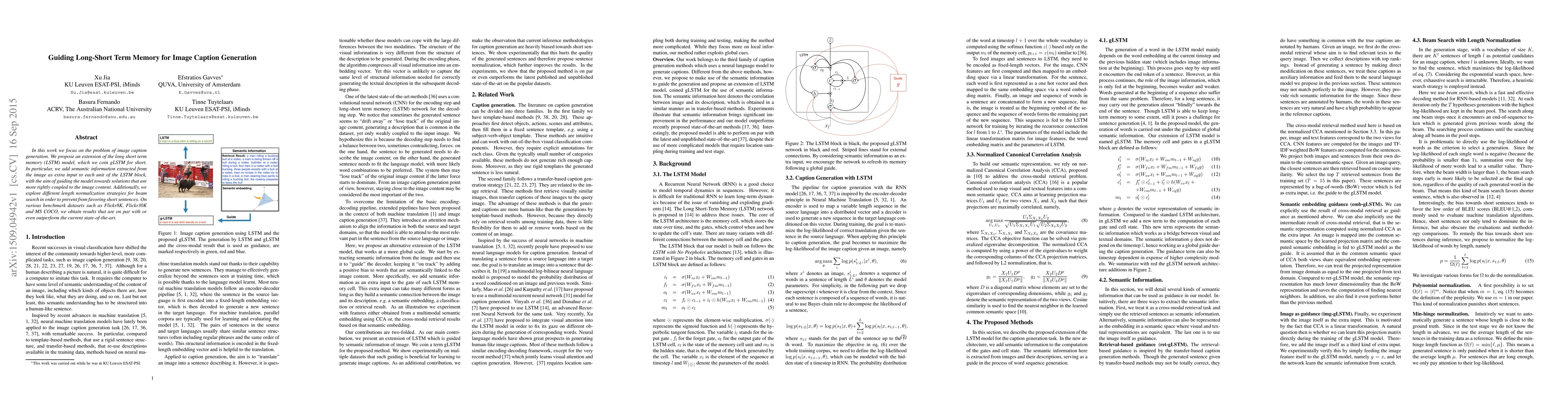 In this work we focus on the problem of image caption generation. We propose an extension of the long short term memory (LSTM) model, which we coin gLSTM for short. In particular, we add semantic information extracted from the image as extra input to each unit of the LSTM block, with the aim of guiding the model towards solutions that are more tightly coupled to the image content. Additionally, we explore different length normalization strategies for beam search in order to prevent from favoring short sentences. On various benchmark datasets such as Flickr8K, Flickr30K and MS COCO, we obtain results that are on par with or even outperform the current state-of-the-art.
