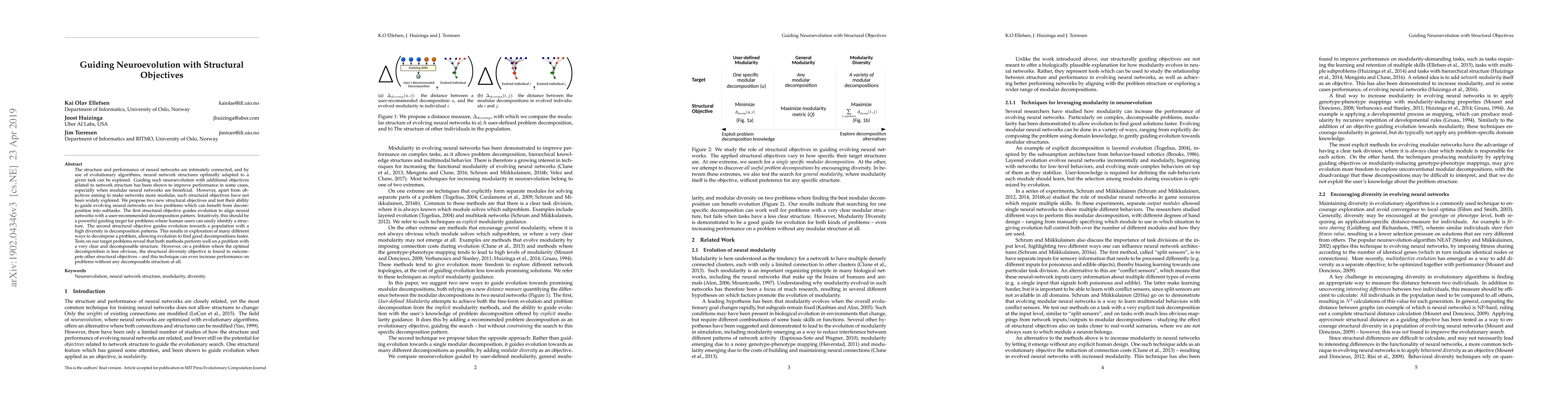 This paper proposes two new structural objectives to guide neuroevolution: one aligns neural networks with user-recommended decomposition patterns, and the other promotes diversity in decomposition patterns. Tests show both methods improve performance on decomposable problems, with the diversity approach excelling on less obvious structures.