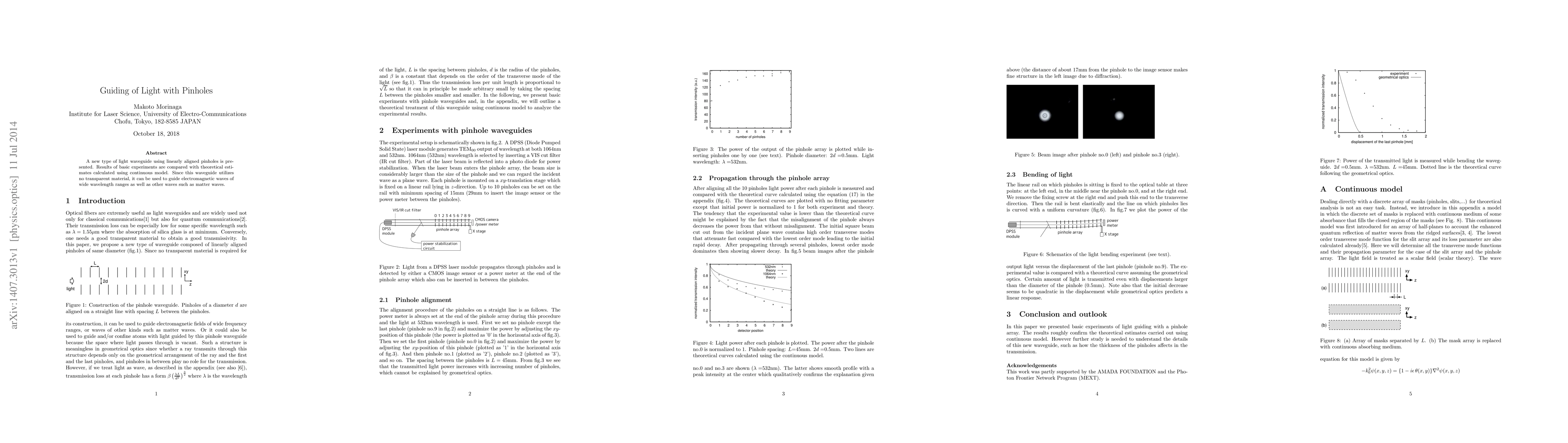 A new type of light waveguide using linearly aligned pinholes is presented. Results of basic experiments are compared with theoretical estimates calculated using continuous model. Since this waveguide utilizes no transparent material, it can be used to guide electromagnetic waves of wide wavelength ranges as well as other waves such as matter waves.