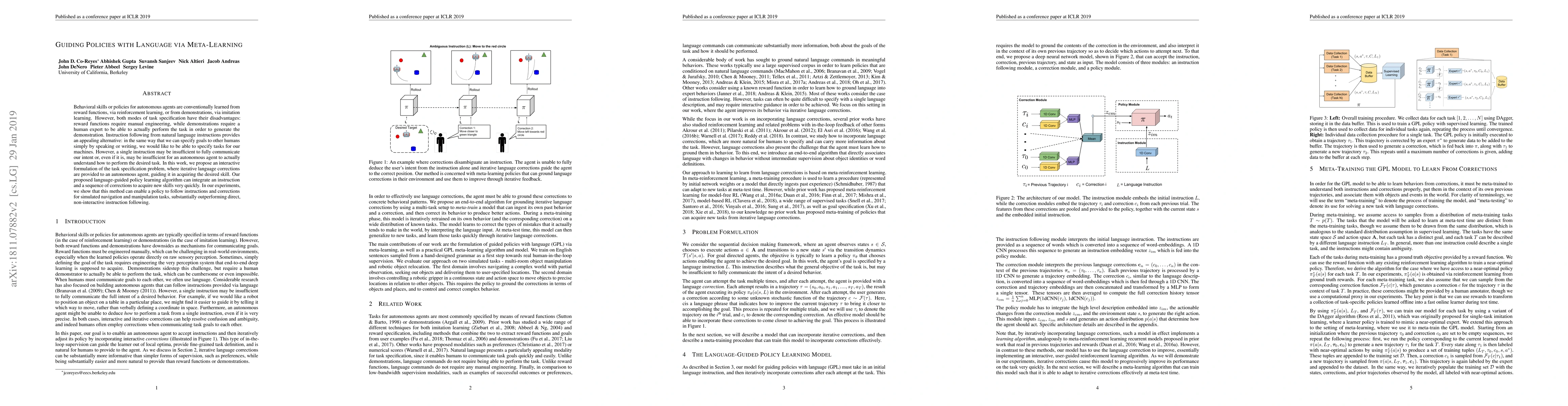 Behavioral skills or policies for autonomous agents are conventionally learned from reward functions, via reinforcement learning, or from demonstrations, via imitation learning. However, both modes of task specification have their disadvantages: reward functions require manual engineering, while demonstrations require a human expert to be able to actually perform the task in order to generate the demonstration. Instruction following from natural language instructions provides an appealing alternative: in the same way that we can specify goals to other humans simply by speaking or writing, we would like to be able to specify tasks for our machines. However, a single instruction may be insufficient to fully communicate our intent or, even if it is, may be insufficient for an autonomous agent to actually understand how to perform the desired task. In this work, we propose an interactive formulation of the task specification problem, where iterative language corrections are provided to an autonomous agent, guiding it in acquiring the desired skill. Our proposed language-guided policy learning algorithm can integrate an instruction and a sequence of corrections to acquire new skills very quickly. In our experiments, we show that this method can enable a policy to follow instructions and corrections for simulated navigation and manipulation tasks, substantially outperforming direct, non-interactive instruction following.