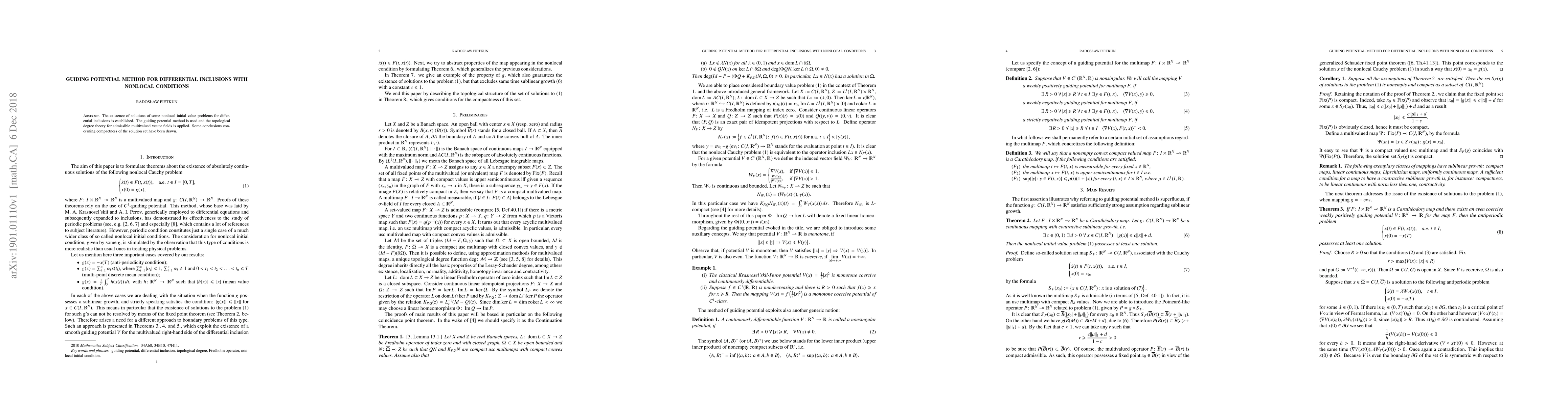 The existence of solutions of some nonlocal initial value problems for differential inclusions is established. The guiding potential method is used and the topological degree theory for admissible multivalued vector fields is applied. Some conclusions concerning compactness of the solution set have been drawn.