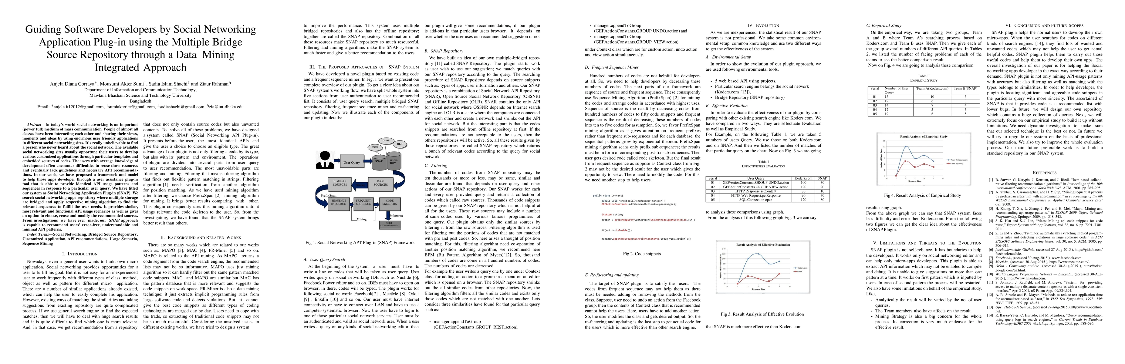 This paper proposes a Social Networking Application Plug-in (SNAP) to assist software developers by integrating data mining with multiple bridged source repositories. SNAP provides relevant API usage patterns and sequences from social networking apps, offering error-free, understandable, and minimal API recommendations.
