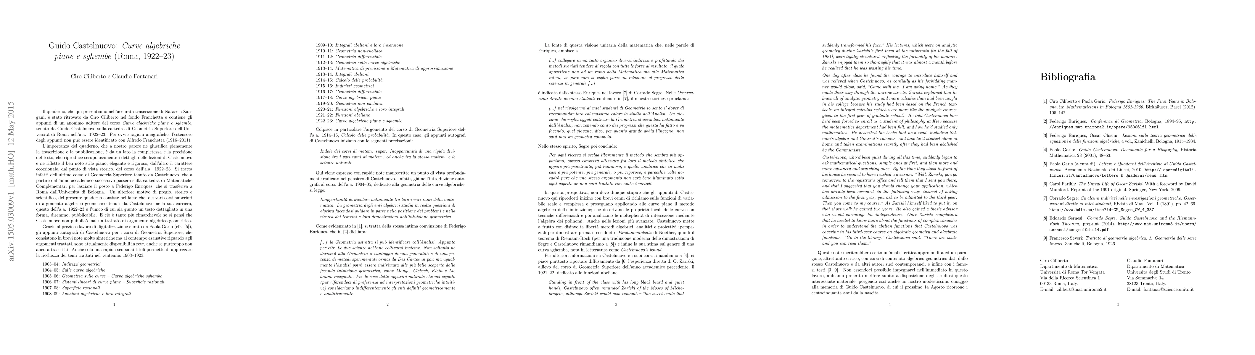 The paper presents a transcription of Guido Castelnuovo's 1922-23 lecture notes on plane and space algebraic curves, offering insights into his last teaching course before his death in 1952. This edition marks the 150th anniversary of Castelnuovo's birth, providing a rare glimpse into the life and work of an influential mathematician.