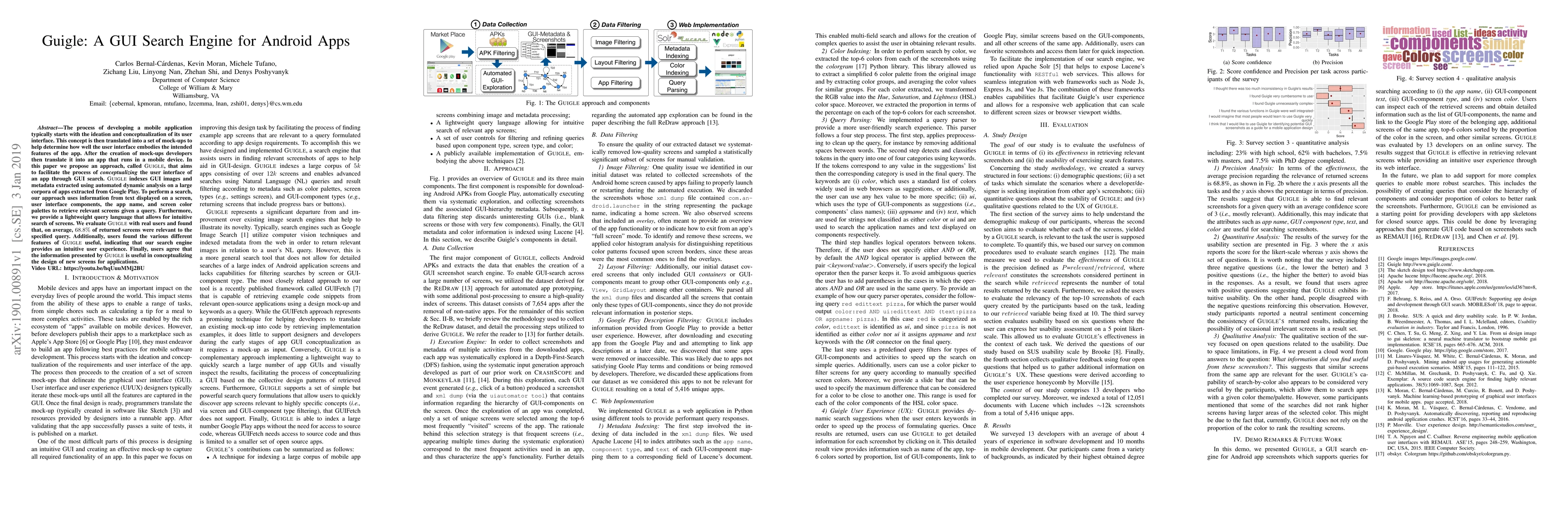 GUIGLE is a GUI search engine for Android apps designed to aid in the conceptualization of user interfaces by indexing GUI images and metadata from Google Play apps. It uses a lightweight query language to search for relevant screens based on text, components, app names, and color palettes, achieving a 68.8% relevance rate in user evaluations.