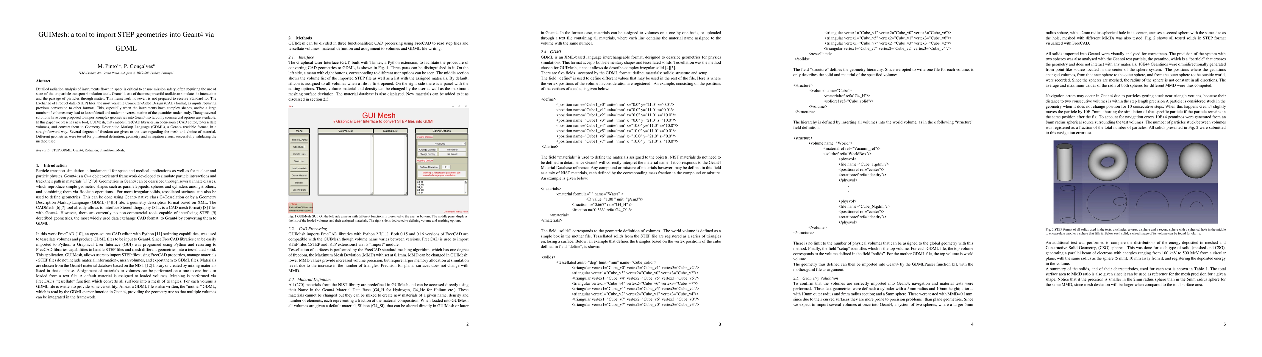 GUIMesh embeds FreeCAD libraries to tessellate volumes from STEP files into GDML format, providing a straightforward method to import complex geometries into Geant4 for radiation simulations.