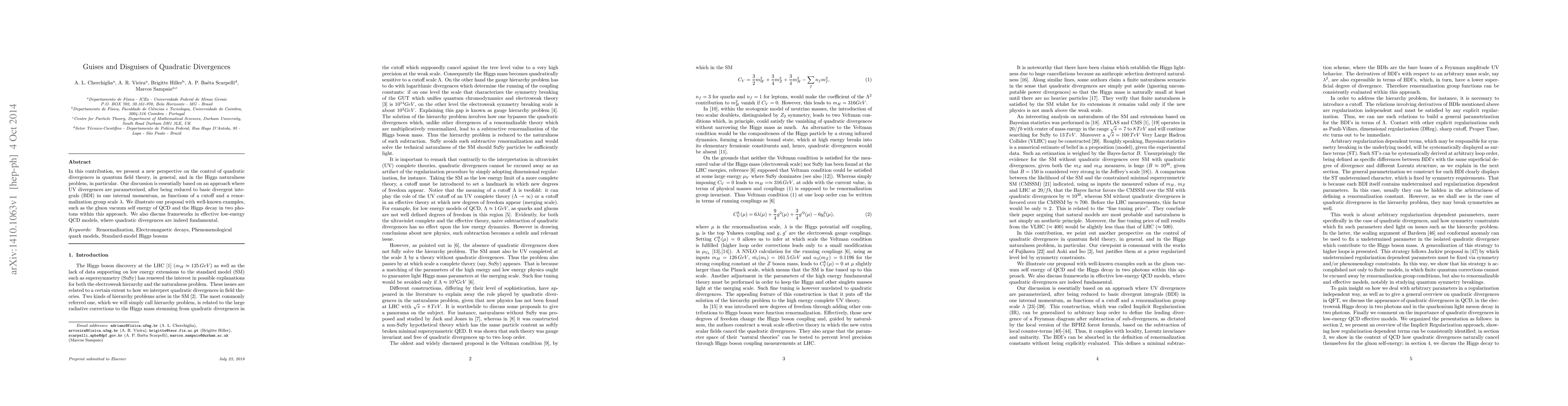 In this contribution, we present a new perspective on the control of quadratic divergences in quantum field theory, in general, and in the Higgs naturalness problem, in particular. Our discussion is essentially based on an approach where UV divergences are parameterized, after being reduced to basic divergent integrals (BDI) in one internal momentum, as functions of a cutoff and a renormalization group scale $\lambda$. We illustrate our proposal with well-known examples, such as the gluon vacuum self energy of QCD and the Higgs decay in two photons within this approach. We also discuss frameworks in effective low-energy QCD models, where quadratic divergences are indeed fundamental.
