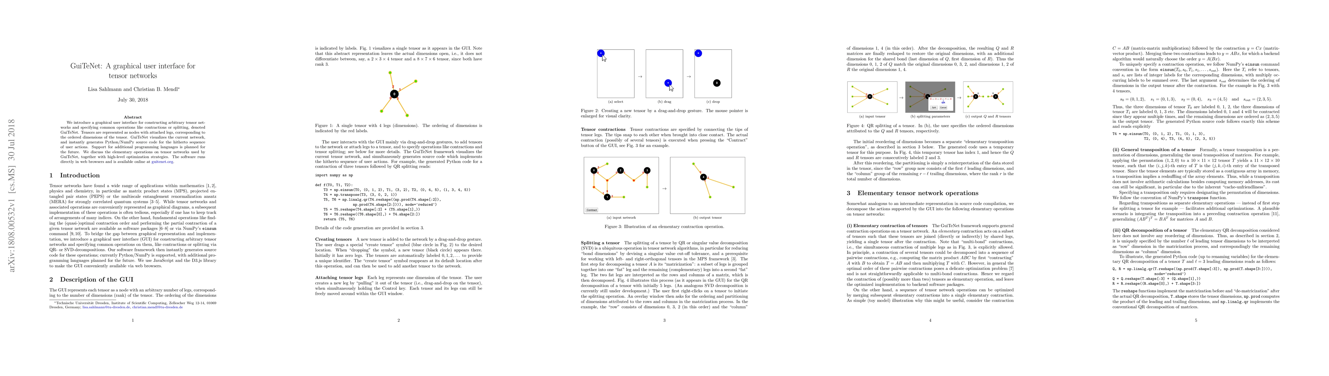GuiTeNet is a web-based graphical user interface for constructing and manipulating tensor networks, generating Python/NumPy code for user actions, with future support for additional languages. It visualizes tensors as nodes and supports operations like contractions and splitting, along with optimization strategies.