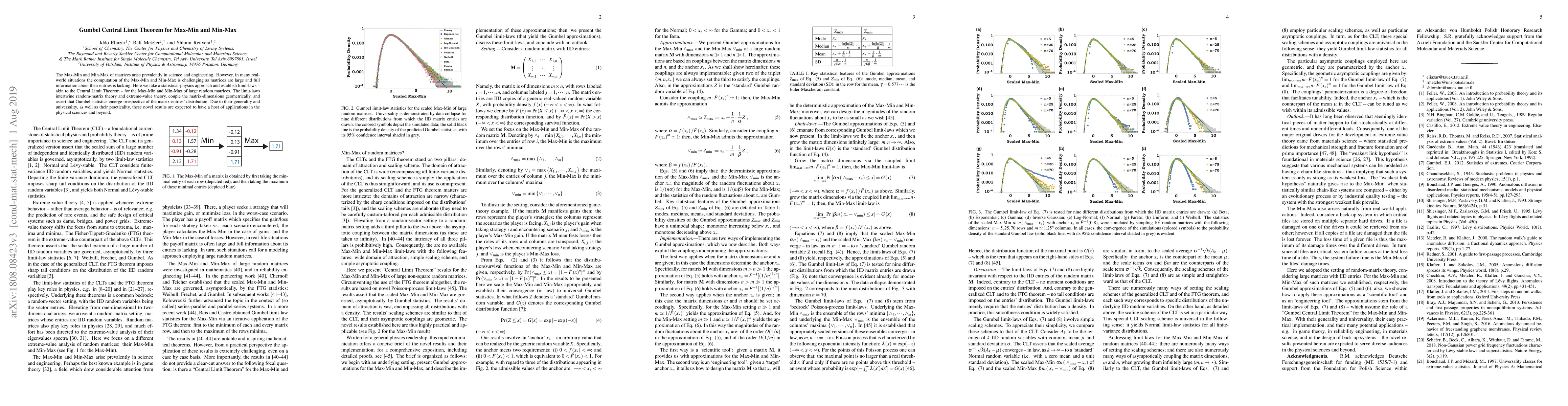This paper establishes limit-laws for the Max-Min and Min-Max of large random matrices, akin to the Central Limit Theorem, showing that Gumbel statistics emerge regardless of the matrix entries' distribution. These results, combining random-matrix theory and extreme-value theory, are expected to have broad applications across the physical sciences.