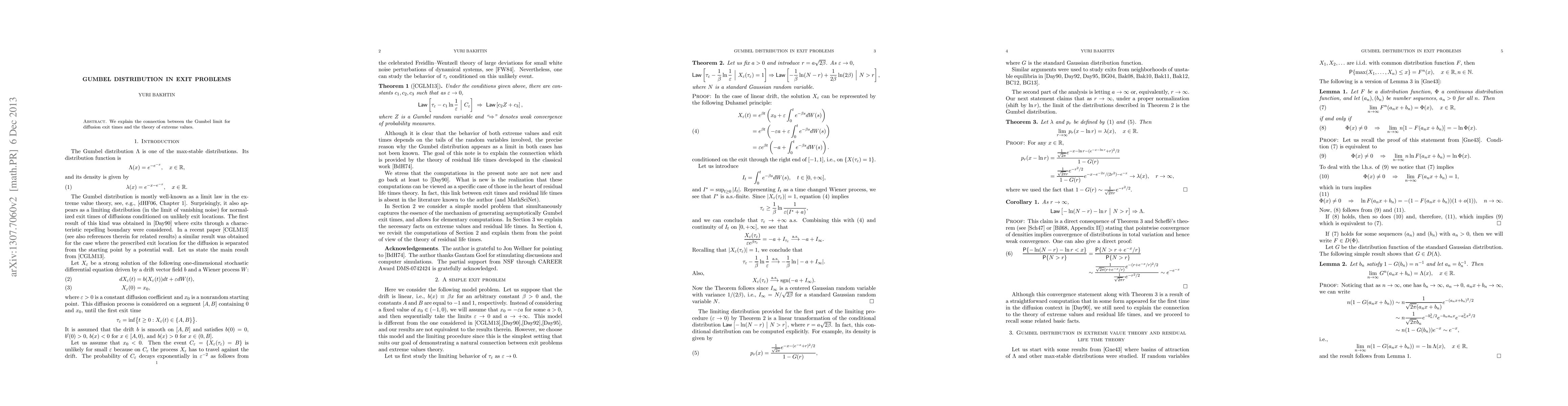 We explain the connection between the Gumbel limit for diffusion exit times and the theory of extreme values.