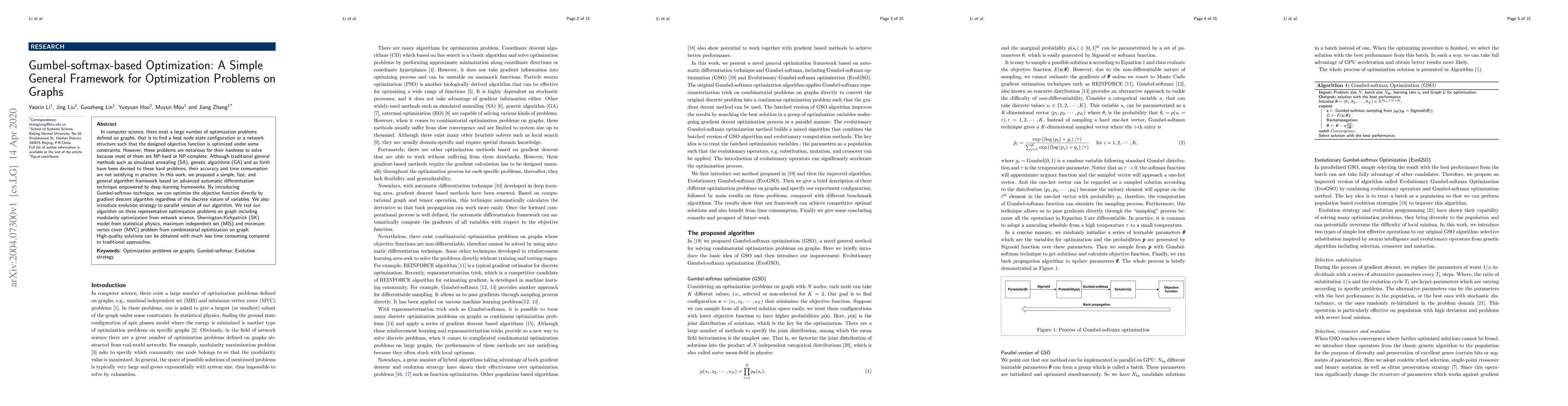 In computer science, there exist a large number of optimization problems defined on graphs, that is to find a best node state configuration or a network structure such that the designed objective function is optimized under some constraints. However, these problems are notorious for their hardness to solve because most of them are NP-hard or NP-complete. Although traditional general methods such as simulated annealing (SA), genetic algorithms (GA) and so forth have been devised to these hard problems, their accuracy and time consumption are not satisfying in practice. In this work, we proposed a simple, fast, and general algorithm framework based on advanced automatic differentiation technique empowered by deep learning frameworks. By introducing Gumbel-softmax technique, we can optimize the objective function directly by gradient descent algorithm regardless of the discrete nature of variables. We also introduce evolution strategy to parallel version of our algorithm. We test our algorithm on three representative optimization problems on graph including modularity optimization from network science, Sherrington-Kirkpatrick (SK) model from statistical physics, maximum independent set (MIS) and minimum vertex cover (MVC) problem from combinatorial optimization on graph. High-quality solutions can be obtained with much less time consuming compared to traditional approaches.