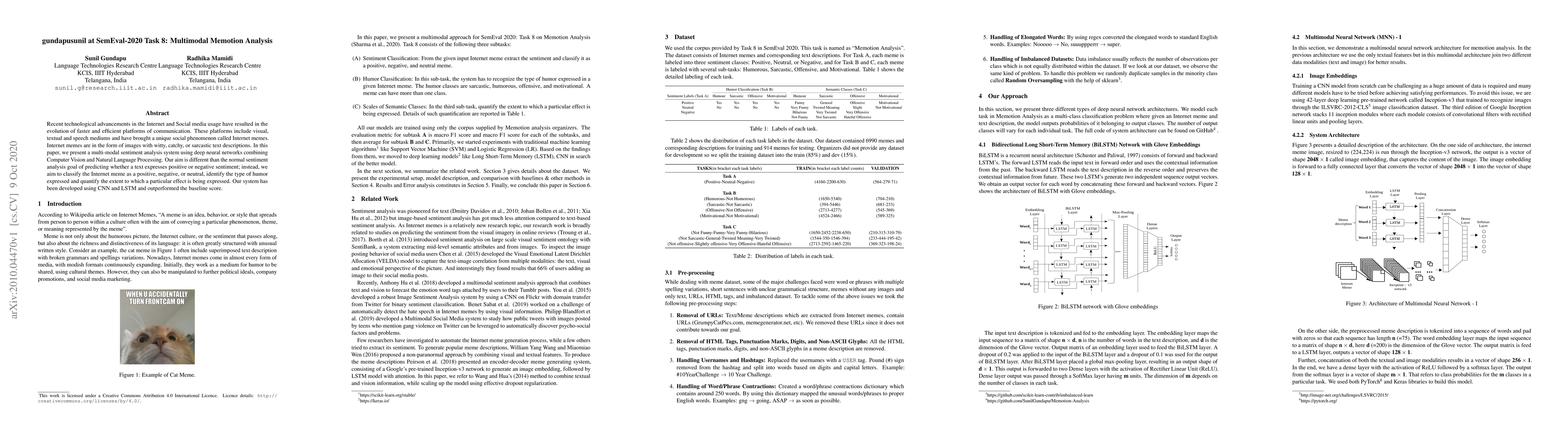 This research paper proposes a multimodal sentiment analysis system that can classify internet memes as positive, negative, or neutral and identify the type of humor expressed. The system outperformed baseline scores using deep neural networks combining computer vision and natural language processing.