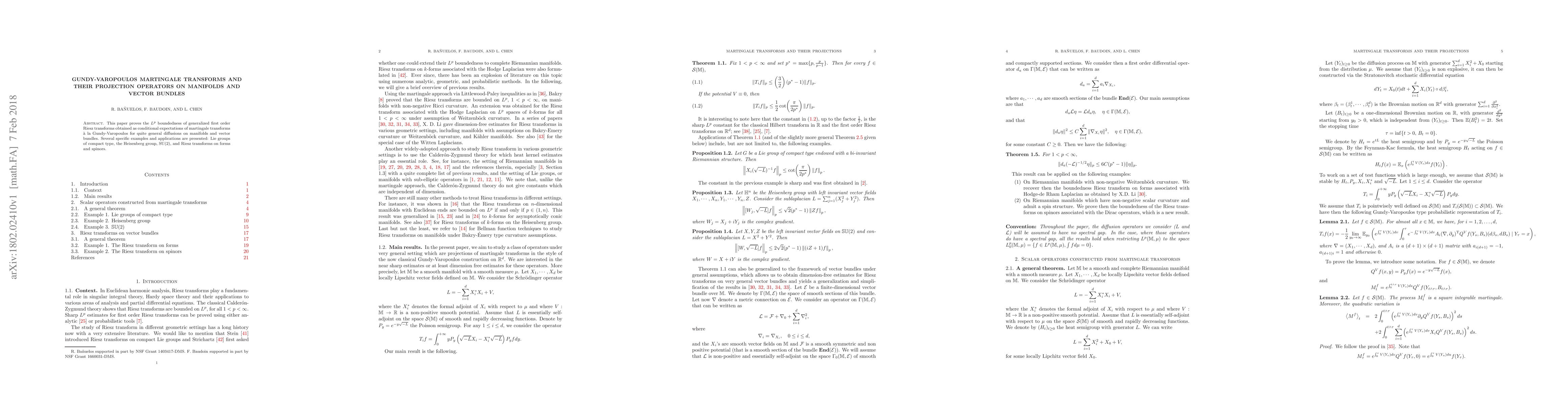 This paper establishes the $L^p$ boundedness of generalized first-order Riesz transforms derived from Gundy-Varopoulos martingale transforms on manifolds and vector bundles, with applications to Lie groups and the Heisenberg group.