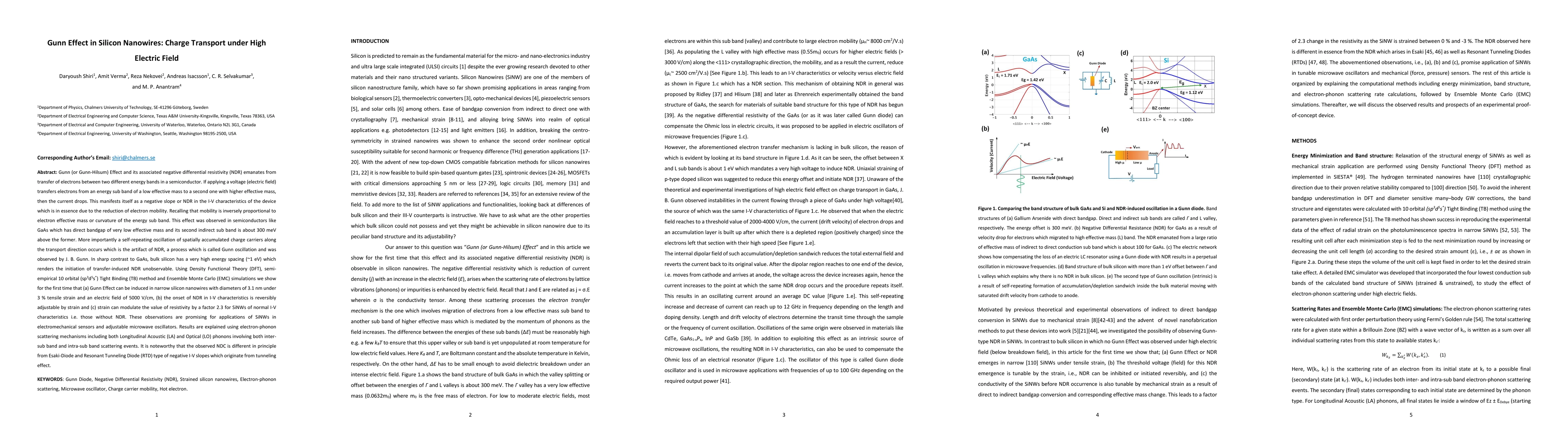 Gunn (or Gunn-Hilsum) Effect and its associated negative differential resistivity (NDR) emanates from transfer of electrons between two different energy bands in a semiconductor. If applying a voltage (electric field) transfers electrons from an energy sub band of a low effective mass to a second one with higher effective mass, then the current drops. This manifests itself as a negative slope or NDR in the I-V characteristics of the device which is in essence due to the reduction of electron mobility. Recalling that mobility is inversely proportional to electron effective mass or curvature of the energy sub band. This effect was observed in semiconductors like GaAs which has direct bandgap of very low effective mass and its second indirect sub band is about 300 meV above the former. More importantly a self-repeating oscillation of spatially accumulated charge carriers along the transport direction occurs which is the artifact of NDR, a process which is called Gunn oscillation and was observed by J. B. Gunn. In sharp contrast to GaAs, bulk silicon has a very high energy spacing (~1 eV) which renders the initiation of transfer-induced NDR unobservable. Using Density Functional Theory (DFT), semi-empirical 10 orbital ($sp^{3}d^{5}s^{*}$) Tight Binding (TB) method and Ensemble Monte Carlo (EMC) simulations we show for the first time that (a) Gunn Effect can be induced in narrow silicon nanowires with diameters of 3.1 nm under 3 % tensile strain and an electric field of 5000 V/cm, (b) the onset of NDR in I-V characteristics is reversibly adjustable by strain and (c) strain can modulate the value of resistivity by a factor 2.3 for SiNWs of normal I-V characteristics i.e. those without NDR. These observations are promising for applications of SiNWs in electromechanical sensors and adjustable microwave oscillators.