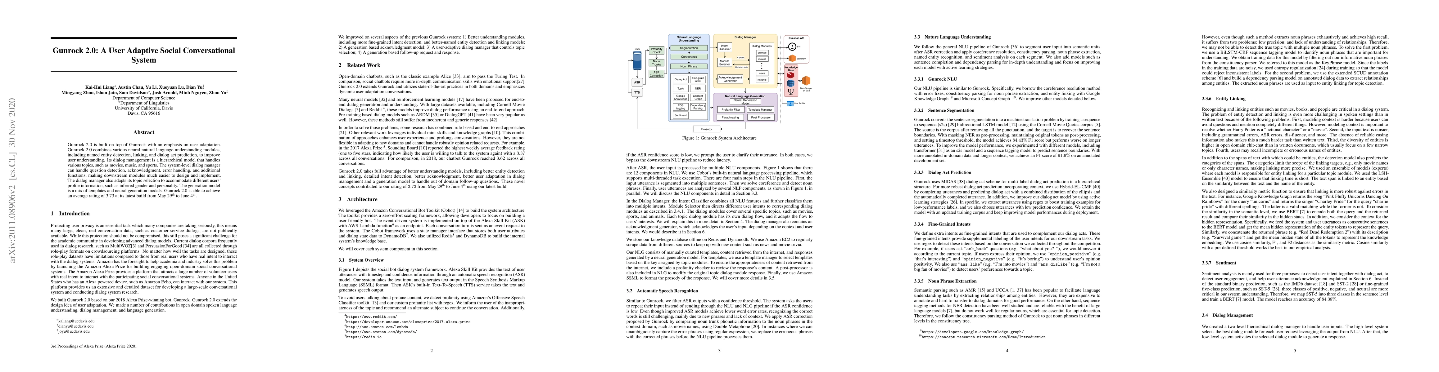 Gunrock 2.0 is built on top of Gunrock with an emphasis on user adaptation. Gunrock 2.0 combines various neural natural language understanding modules, including named entity detection, linking, and dialog act prediction, to improve user understanding. Its dialog management is a hierarchical model that handles various topics, such as movies, music, and sports. The system-level dialog manager can handle question detection, acknowledgment, error handling, and additional functions, making downstream modules much easier to design and implement. The dialog manager also adapts its topic selection to accommodate different users' profile information, such as inferred gender and personality. The generation model is a mix of templates and neural generation models. Gunrock 2.0 is able to achieve an average rating of 3.73 at its latest build from May 29th to June 4th.