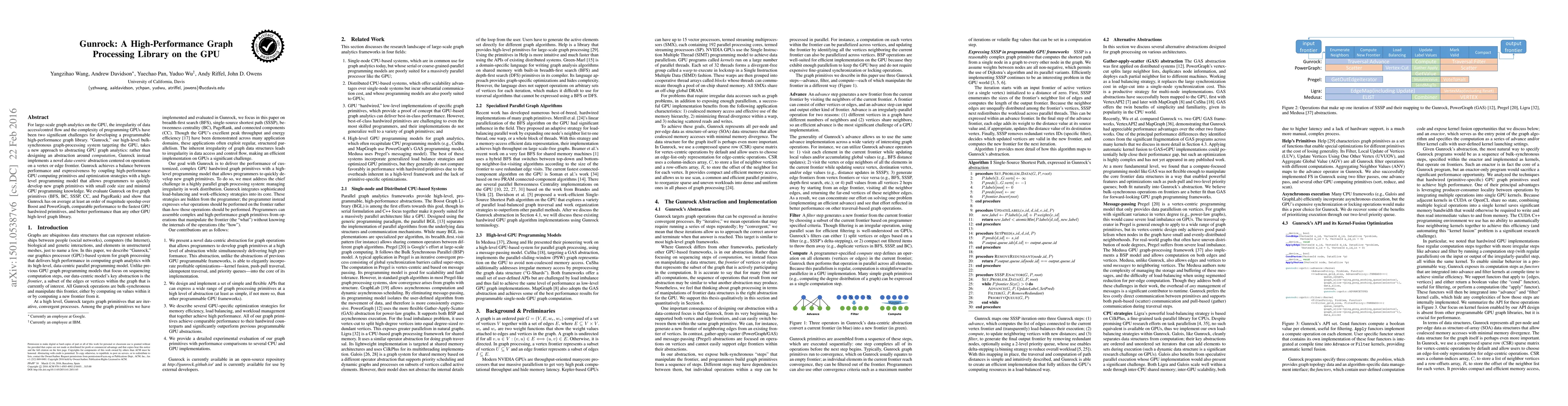 Gunrock is a high-performance GPU-based graph processing library that addresses the challenges of irregular data access and complex GPU programming through a high-level, bulk-synchronous model. It achieves significant speedups over existing libraries and offers comparable performance to hardwired GPU primitives.
