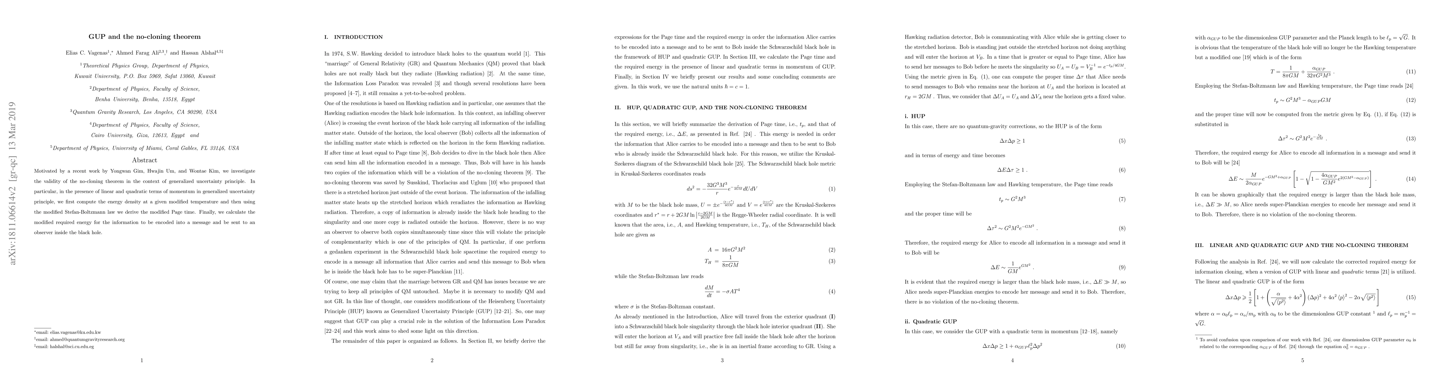 This paper examines the no-cloning theorem under the influence of a generalized uncertainty principle, finding that linear and quadratic momentum terms modify the energy density and Page time, ultimately affecting the required energy for information encoding within a black hole.