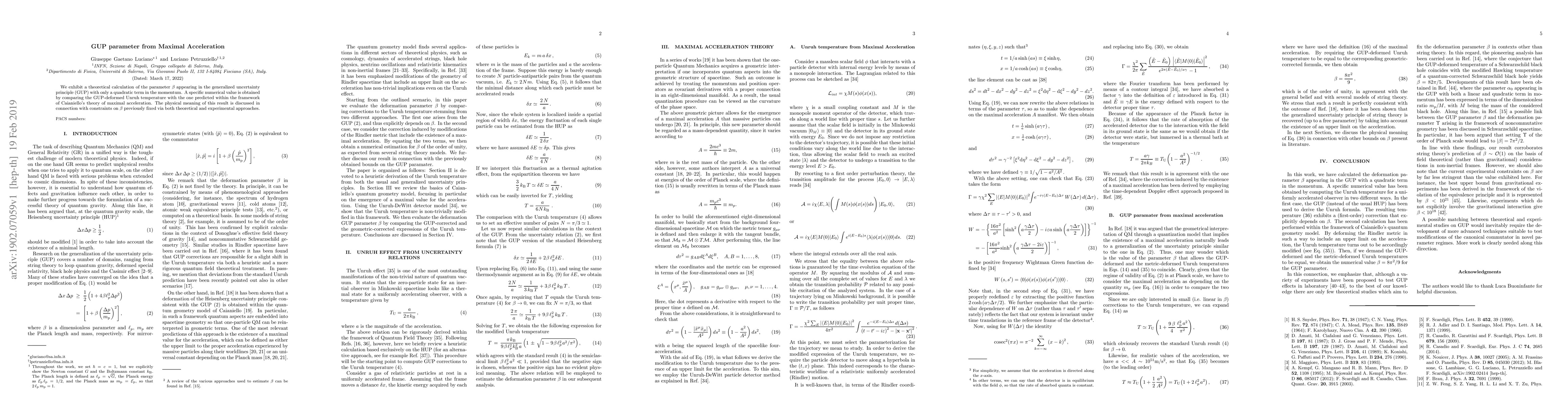 This paper calculates the GUP parameter β using a quadratic momentum term and derives a specific numerical value by comparing GUP-deformed Unruh temperature with Caianiello's maximal acceleration theory, discussing its implications in light of previous theoretical and experimental constraints.