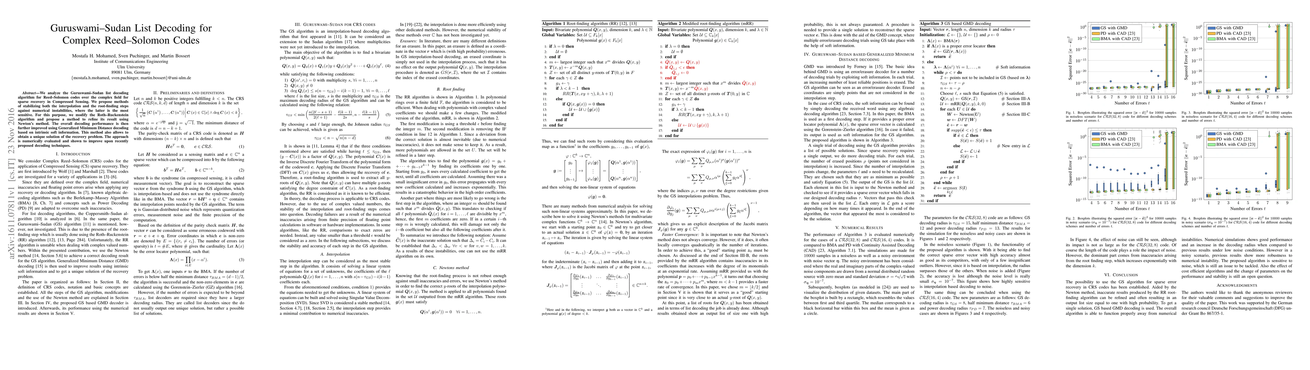 This paper presents an enhanced version of the Guruswami--Sudan list decoding algorithm for Reed--Solomon codes over the complex field, focusing on stability improvements in interpolation and root-finding for sparse recovery in Compressed Sensing. The refined Roth--Ruckenstein algorithm and Newton's method are used to stabilize the root-finding step, which is crucial for performance.