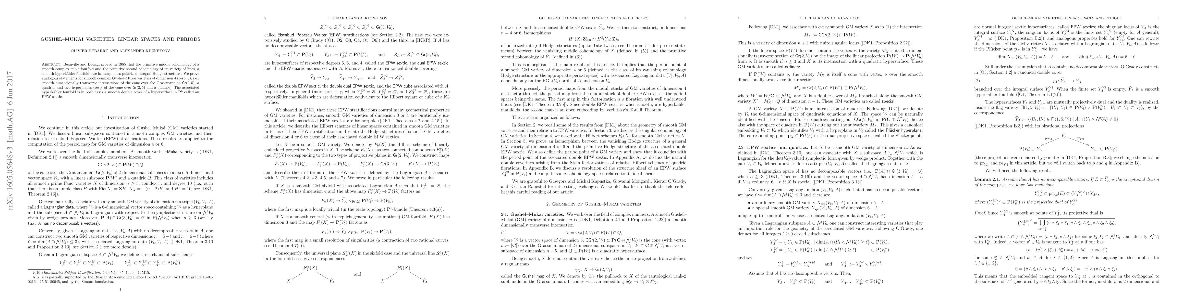 Beauville and Donagi proved in 1985 that the primitive middle cohomology of a smooth complex cubic fourfold and the primitive second cohomology of its variety of lines, a smooth hyperk\"ahler fourfold, are isomorphic as polarized integral Hodge structures. We prove analogous statements for smooth complex Gushel-Mukai varieties of dimension 4 (resp. 6), i.e., smooth dimensionally transverse intersections of the cone over the Grassmannian Gr(2,5), a quadric, and two hyperplanes (resp. of the cone over Gr(2,5) and a quadric). The associated hyperk\"ahler fourfold is in both cases a smooth double cover of a hypersurface in ${\bf P}^5$ called an EPW sextic.