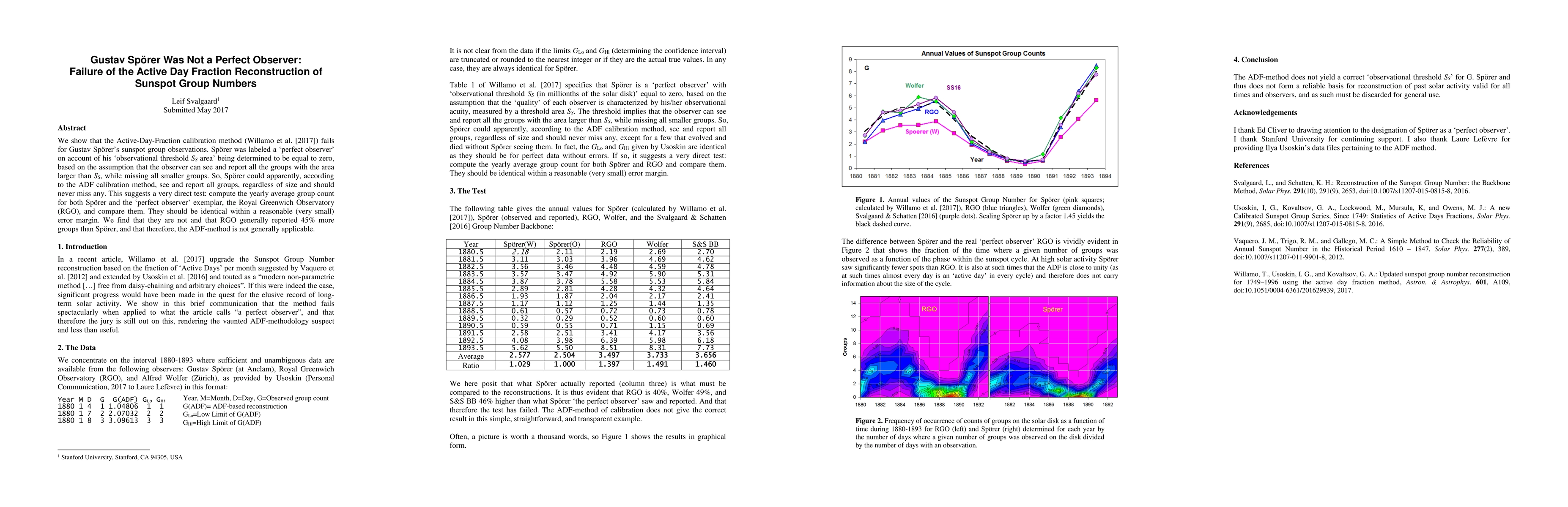 We show that the Active-Day-Fraction calibration method (Willamo et al. [2017]) fails for Gustav Sp\"orer's sunspot group observations. Sp\"orer was labeled a 'perfect observer' on account of his 'observational threshold SS area' being determined to be equal to zero, based on the assumption that the observer can see and report all the groups with the area larger than SS, while missing all smaller groups. So, Sp\"orer could apparently, according to the ADF calibration method, see and report all groups, regardless of size and should never miss any. This suggests a very direct test: compute the yearly average group count for both Sp\"orer and the 'perfect observer' exemplar, the Royal Greenwich Observatory (RGO), and compare them. They should be identical within a reasonable (very small) error margin. We find that they are not and that RGO generally reported 45% more groups than Sp\"orer, and that therefore, the ADF-method is not generally applicable