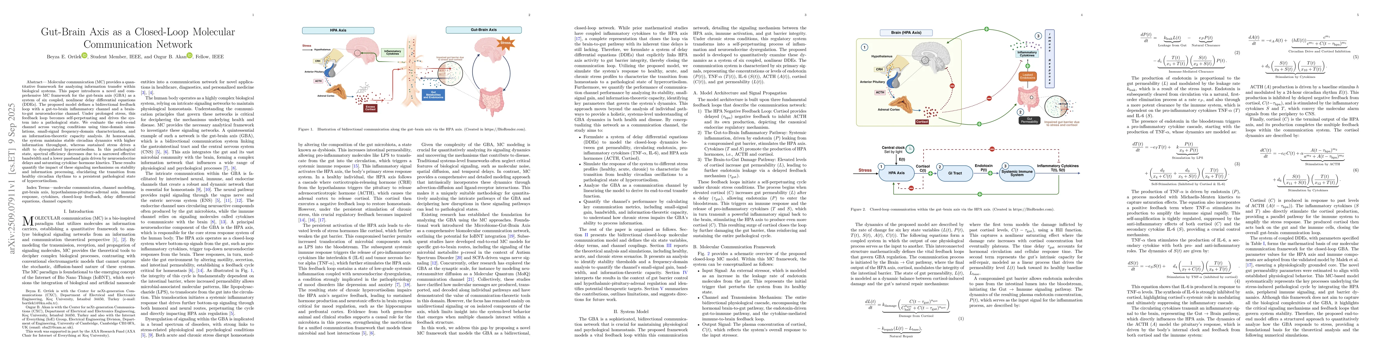 Molecular communication (MC) provides a quantitative framework for analyzing information transfer within biological systems. This paper introduces a novel and comprehensive MC framework for the gut-brain axis (GBA) as a system of six coupled, nonlinear delay differential equations (DDEs). The proposed model defines a bidirectional feedback loop with a gut-to-brain inflammatory channel and a brain-to-gut neuroendocrine channel. Under prolonged stress, this feedback loop becomes self-perpetuating and drives the system into a pathological state. We evaluate the end-to-end channel across varying conditions using time-domain simulations, small-signal frequency-domain characterization, and an information-theoretic capacity analysis. At homeostasis, the system maintains stable circadian dynamics with higher information throughput, whereas sustained stress drives a shift to dysregulated hypercortisolism. In this pathological state, spectral efficiency decreases due to a narrowed effective bandwidth and a lower passband gain driven by neuroendocrine delays and saturating cytokine-hormone kinetics. These results quantify the impact of these signaling mechanisms on stability and information processing, elucidating the transition from healthy circadian rhythms to a persistent pathological state of hypercortisolism.