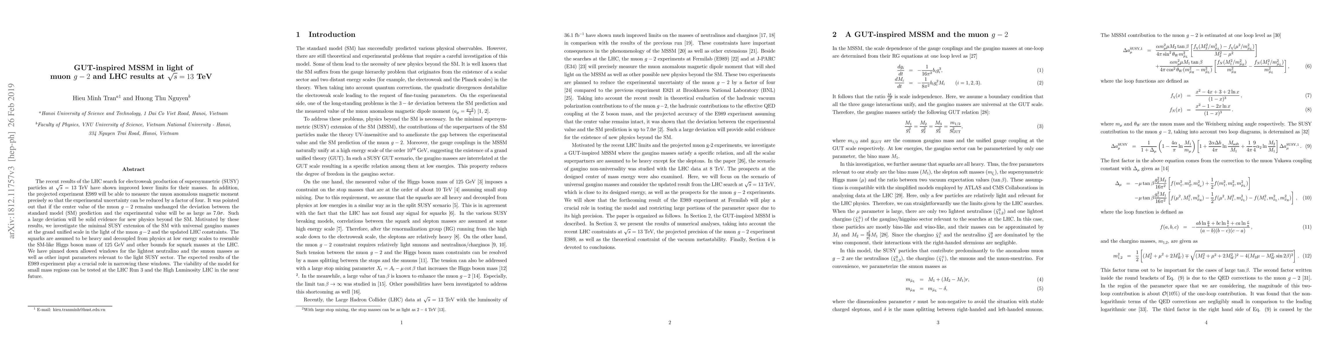 This paper examines the minimal supersymmetric standard model (MSSM) with universal gaugino masses, focusing on its alignment with the muon anomalous magnetic moment ($g-2$) and recent LHC results at 13 TeV. It identifies viable parameter regions for the lightest neutralino and smuon masses, emphasizing the crucial role of the E989 experiment in further constraining these regions, with potential LHC tests in the near future.