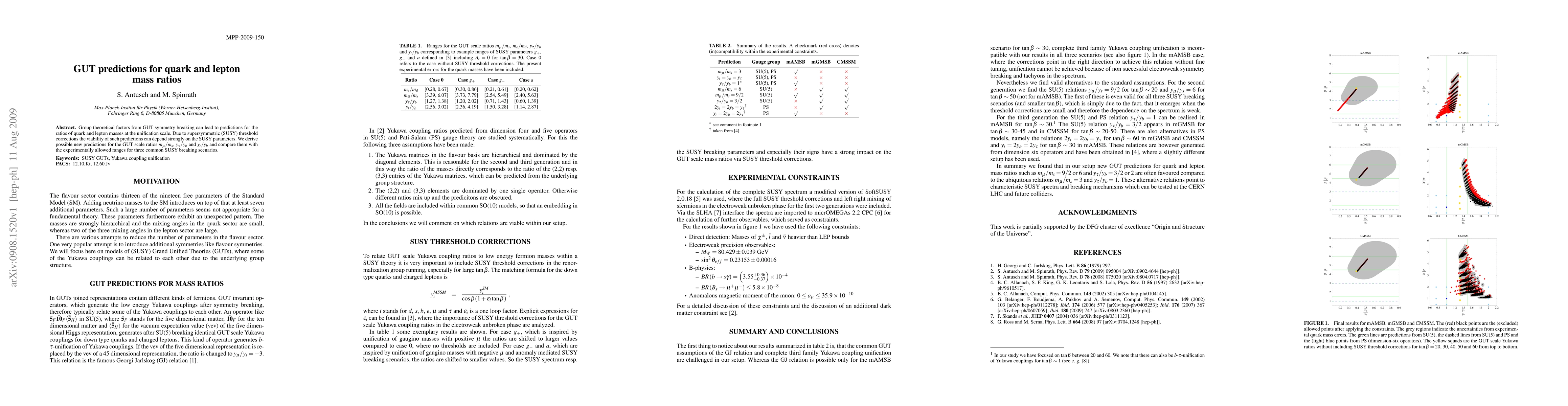 This paper explores how group theoretical factors from Grand Unified Theory (GUT) symmetry breaking predict quark and lepton mass ratios at the unification scale, with a focus on the impact of supersymmetric (SUSY) threshold corrections. It derives new predictions for GUT scale ratios and compares them with experimental ranges under three common SUSY breaking scenarios.