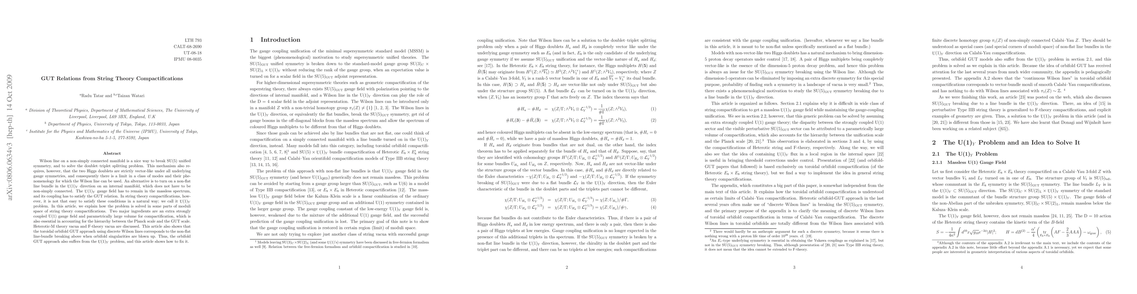 Wilson line on a non-simply connected manifold is a nice way to break SU(5) unified symmetry, and to solve the doublet--triplet splitting problem. This mechanism also requires, however, that the two Higgs doublets are strictly vector-like under all underlying gauge symmetries, and consequently there is a limit in a class of modes and their phenomenology for which the Wilson line can be used. An alternative is to turn on a non-flat line bundle in the U(1)_Y direction on an internal manifold, which does not have to be non-simply connected. The U(1)_Y gauge field has to remain in the massless spectrum, and its coupling has to satisfy the GUT relation. In string theory compactifications, however, it is not that easy to satisfy these conditions in a natural way; we call it U(1)_Y problem. In this article, we explain how the problem is solved in some parts of moduli space of string theory compactifications. Two major ingredients are an extra strongly coupled U(1) gauge field and parametrically large volume for compactification that is also essential in accounting for the hierarchy between the Planck scale and the GUT scale. Heterotic-M theory vacua and F-theory vacua are discussed. This article also shows that the toroidal orbifold GUT approach using discrete Wilson lines corresponds to the non-flat line-bundle breaking above when orbifold singularities are blown up. Thus, the orbifold GUT approach also suffers from the U(1)_Y problem, and this article shows how to fix it.