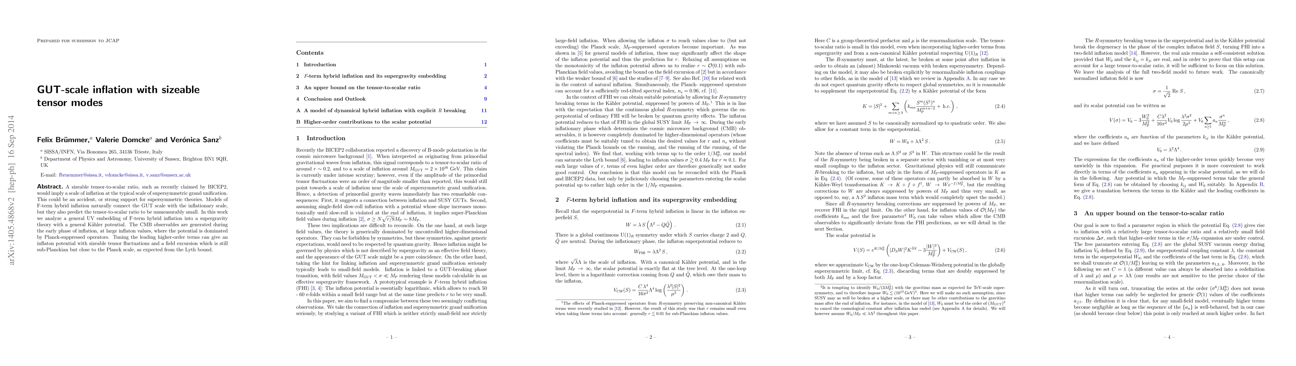 A sizeable tensor-to-scalar ratio, such as recently claimed by BICEP2, would imply a scale of inflation at the typical scale of supersymmetric grand unification. This could be an accident, or strong support for supersymmetric theories. Models of F-term hybrid inflation naturally connect the GUT scale with the inflationary scale, but they also predict the tensor-to-scalar ratio to be unmeasurably small. In this work we analyze a general UV embedding of F-term hybrid inflation into a supergravity theory with a general Kahler potential. The CMB observables are generated during the early phase of inflation, at large inflaton values, where the potential is dominated by Planck-suppressed operators. Tuning the leading higher-order terms can give an inflaton potential with sizeable tensor fluctuations and a field excursion which is still sub-Planckian but close to the Planck scale, as expected from the Lyth bound.