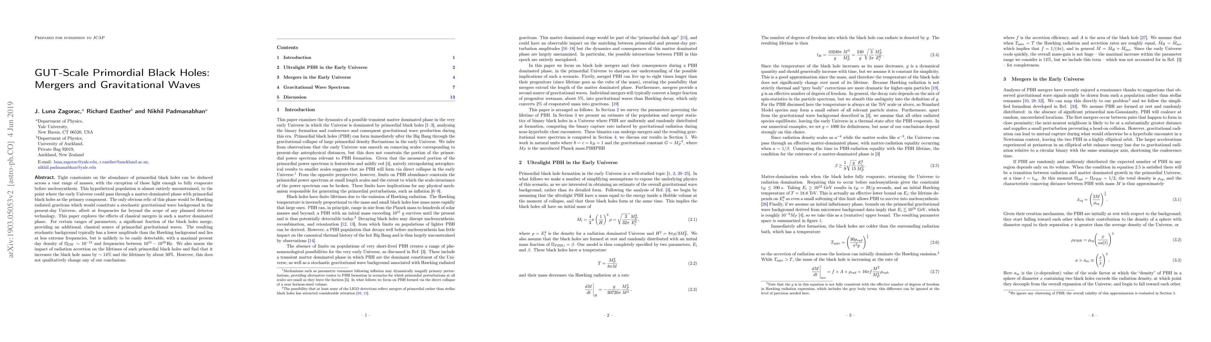 This paper investigates the potential mergers of GUT-scale primordial black holes in a matter-dominated early Universe, predicting a classical source of gravitational waves from these mergers. The resulting gravitational wave background is unlikely to be detectable, with a density of $\Omega_{GW} \sim 10^{-12}$ at frequencies between $10^{15} - 10^{19}$ Hz.