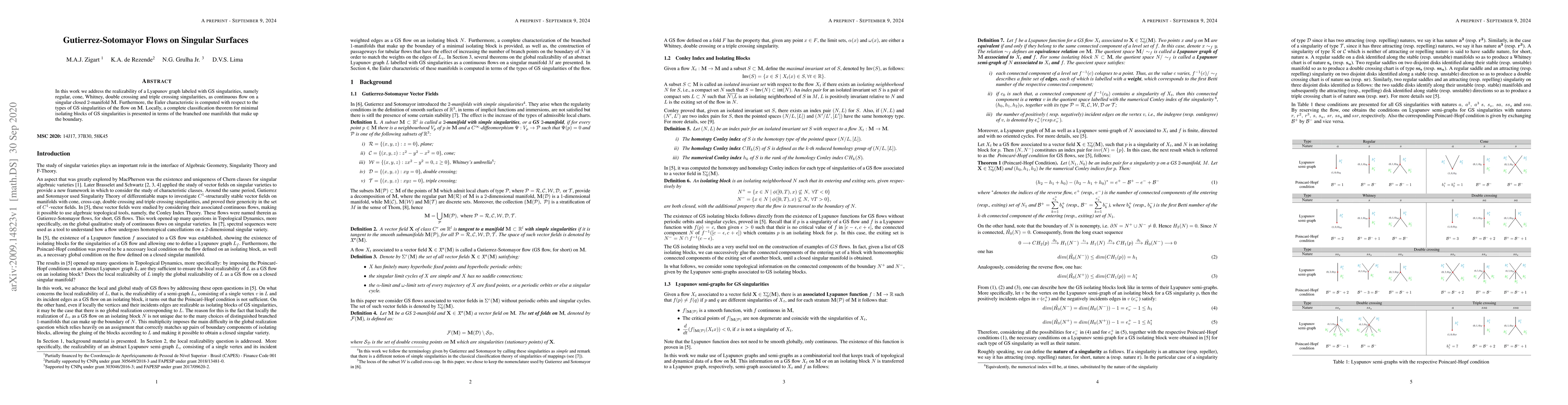 In this work we address the realizability of a Lyapunov graph labeled with GS singularities, namely regular, cone, Whitney, double crossing and triple crossing singularities, as continuous flow on a singular closed $2$-manifold $\mathbf{M}$. Furthermore, the Euler characteristic is computed with respect to the types of GS singularities of the flow on $\mathbf{M}$. Locally, a complete classification theorem for minimal isolating blocks of GS singularities is presented in terms of the branched one manifolds that make up the boundary.