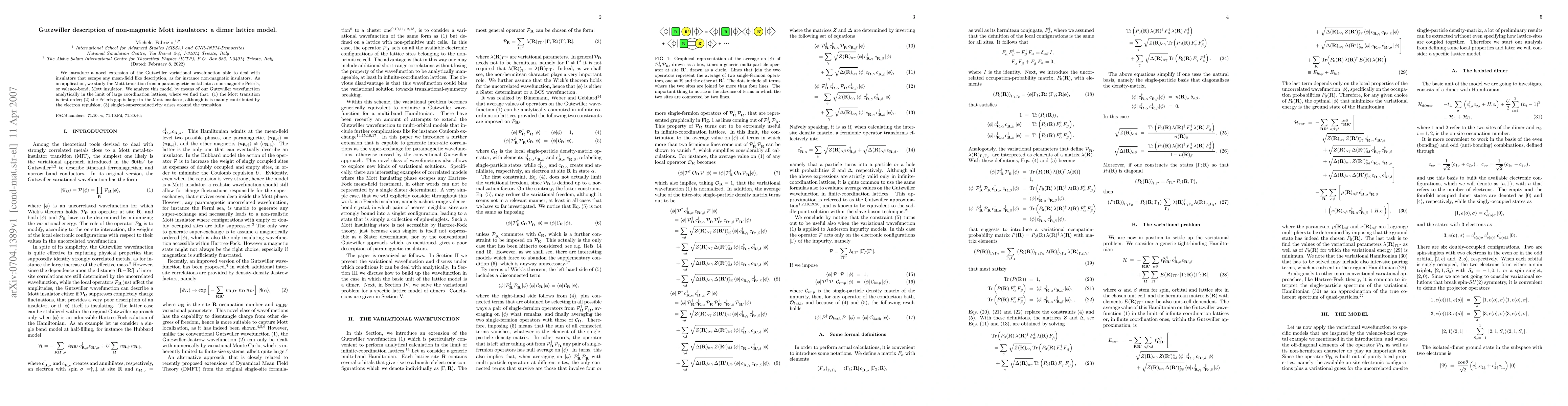 This paper extends the Gutzwiller variational wavefunction to describe non-magnetic Mott insulators, particularly focusing on a dimer lattice model. The study reveals a first-order Mott transition, significant Peierls gap in the Mott insulator primarily due to electron repulsion, and the emergence of singlet-superconductivity near the transition.
