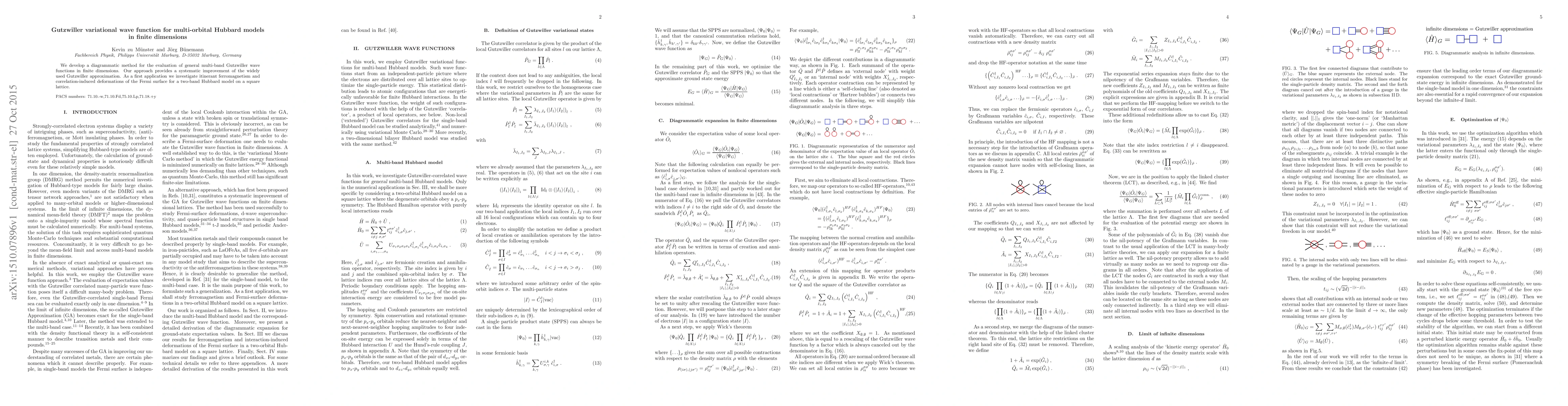 This paper introduces a diagrammatic method for evaluating multi-band Gutzwiller wave functions in finite dimensions, offering a systematic enhancement over the traditional Gutzwiller approximation. The method is applied to study itinerant ferromagnetism and Fermi surface deformations in a two-band Hubbard model on a square lattice.