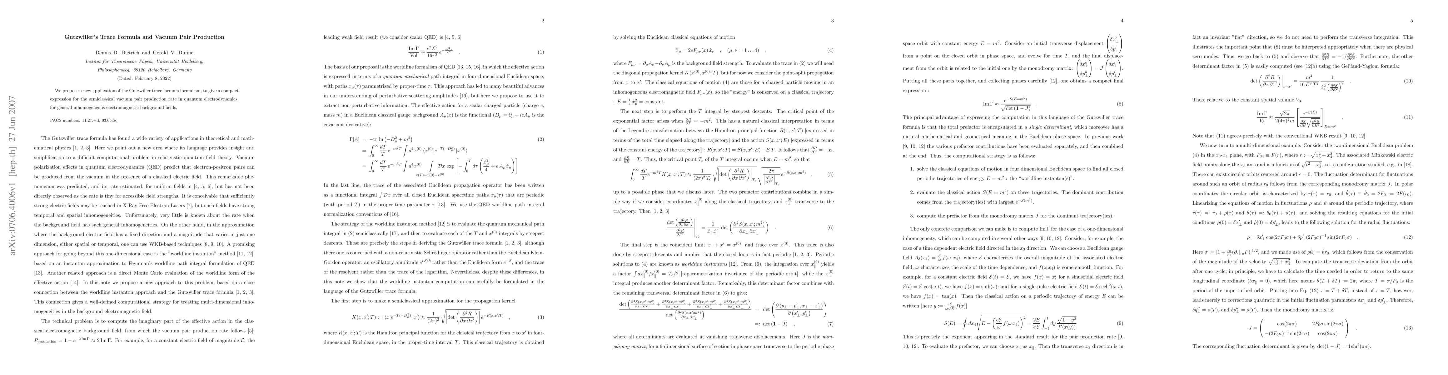 We propose a new application of the Gutzwiller trace formula formalism, to give a compact expression for the semiclassical vacuum pair production rate in quantum electrodynamics, for general inhomogeneous electromagnetic background fields.