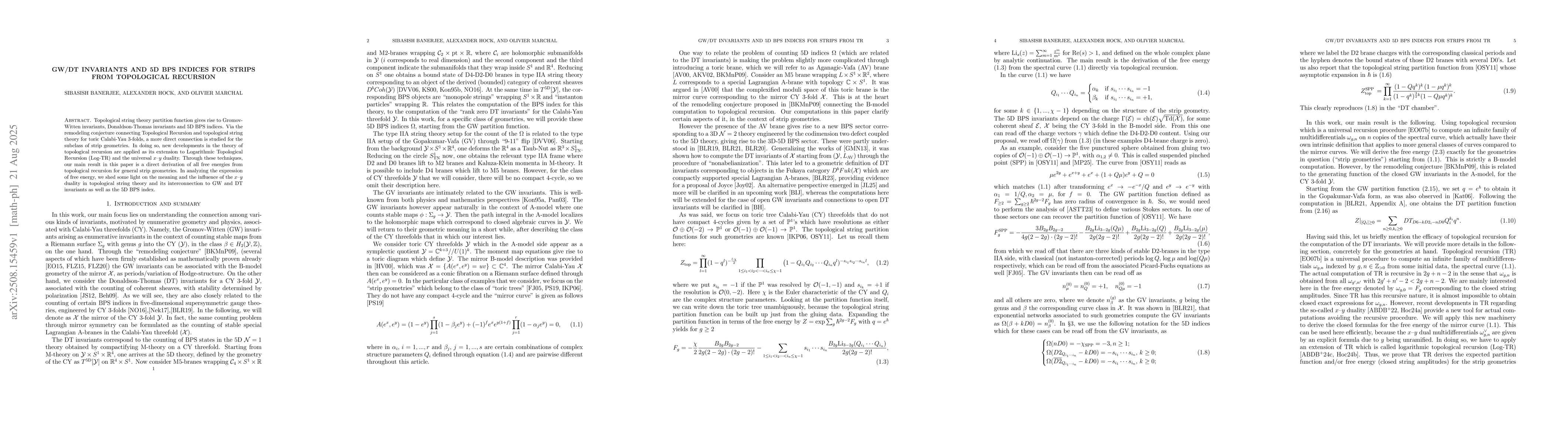 Topological string theory partition function gives rise to Gromov-Witten invariants, Donaldson-Thomas invariants and 5D BPS indices. Via the remodeling conjecture connecting Topological Recursion and topological string theory for toric Calabi-Yau 3-folds, a more direct connection is studied for the subclass of strip geometries. In doing so, new developments in the theory of topological recursion are applied as its extension to Logarithmic Topological Recursion (Log-TR) and the universal $x$--$y$ duality. Through these techniques, our main result in this paper is a direct derivation of all free energies from topological recursion for general strip geometries. In analyzing the expression of free energy, we shed some light on the meaning and the influence of the $x$--$y$ duality in topological string theory and its interconnection to GW and DT invariants as well as the 5D BPS index.