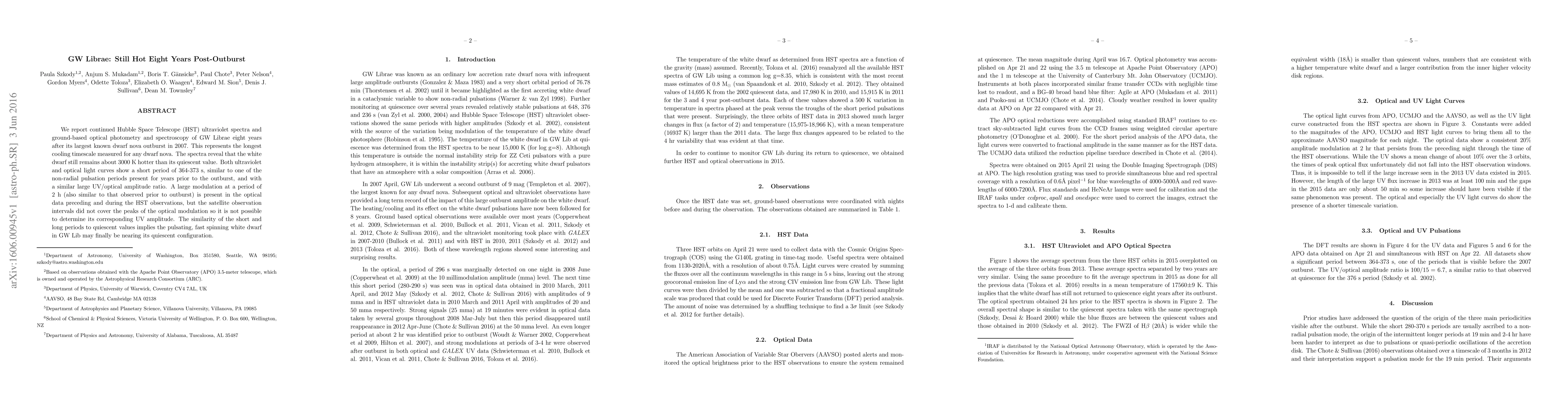 We report continued Hubble Space Telescope (HST) ultraviolet spectra and ground-based optical photometry and spectroscopy of GW Librae eight years after its largest known dwarf nova outburst in 2007. This represents the longest cooling timescale measured for any dwarf nova. The spectra reveal that the white dwarf still remains about 3000 K hotter than its quiescent value. Both ultraviolet and optical light curves show a short period of 364-373 s, similar to one of the non-radial pulsation periods present for years prior to the outburst, and with a similar large UV/optical amplitude ratio. A large modulation at a period of 2 h (also similar to that observed prior to outburst) is present in the optical data preceding and during the HST observations, but the satellite observation intervals did not cover the peaks of the optical modulation so it is not possible to determine its corresponding UV amplitude. The similarity of the short and long periods to quiescent values implies the pulsating, fast spinning white dwarf in GW Lib may finally be nearing its quiescent configuration.