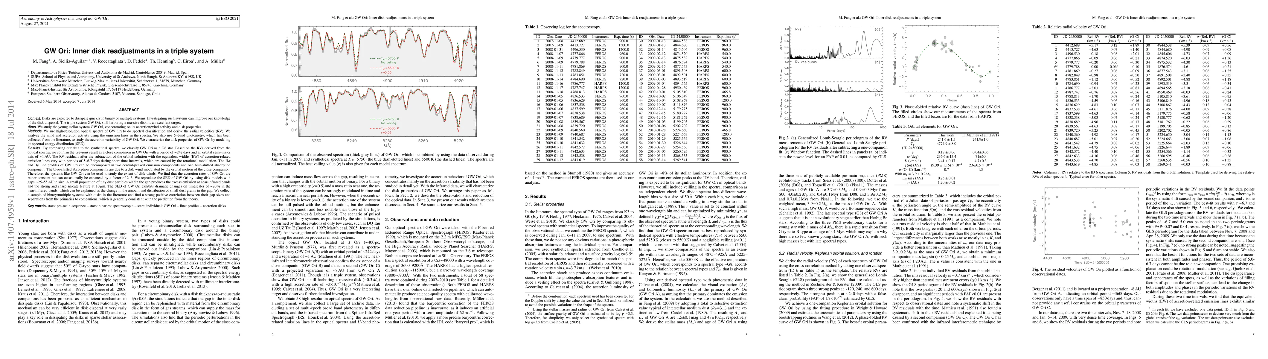 (abridged) We study the young stellar system GW Ori, concentrating on its accretion/wind activity by using our high-resolution optical spectra and $U$-band photometry. We also characterize the disk properties of GW Ori by modeling its spectral energy distribution (SED). By comparing our data to the synthetical spectra, we classify GW Ori as a G8 star. Based on the RVs derived from the spectra, we confirm the previous result as a close companion in GW Ori with a period of ~242 days and an orbital semi-major axis of ~1 AU. The RV residuals after the subtraction of the orbital solution with the equivalent widths of accretion-related emission lines vary with periods of 5-6.7 days during short time intervals, which are caused by the rotational modulation. The H$\alpha$ and H$\beta$ line profiles of GW Ori can be decomposed in two central-peaked emission components and one blue-shifted absorption component. The absorption components are due to a disk wind modulated by the orbital motion of the close companion. Therefore, the systems like GW Ori can be used to study the extent of disk winds. We find that the accretion rates of GW Ori are rather constant but can occasionally be enhanced by a factor of 2-3. We reproduce the SED of GW Ori by using disk models with gaps ~25-55 AU in size. A small population of tiny dust particles within the gap produces the excess emission at near-infrared bands and the strong and sharp silicate feature at 10 $\mu$m. The SED of GW Ori exhibits dramatic changes on timescales of ~20 yr in the near-infrared bands, which can be explained as the change in the amount and distribution of small dust grains in the gap. We collect a sample of binary/multiple systems with disks in the literature and find a strong positive correlation between their gap sizes and separations from the primaries to companions, which is generally consistent with the prediction from the theory.