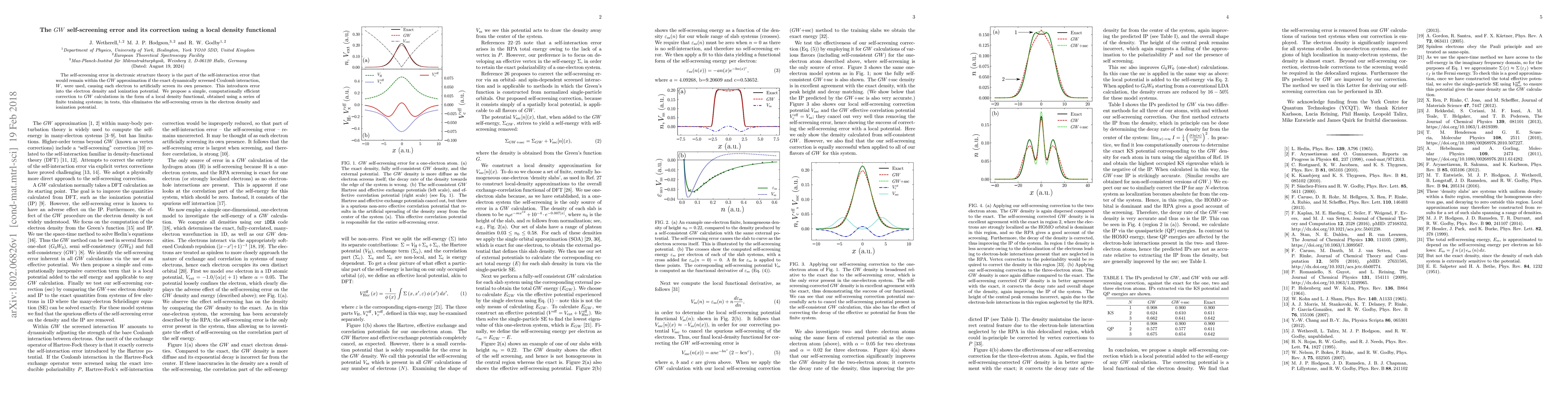 The paper addresses the self-screening error in $GW$ electronic structure calculations, proposing a local density functional correction derived from training systems to eliminate this error, thereby improving the accuracy of electron density and ionization potential predictions.