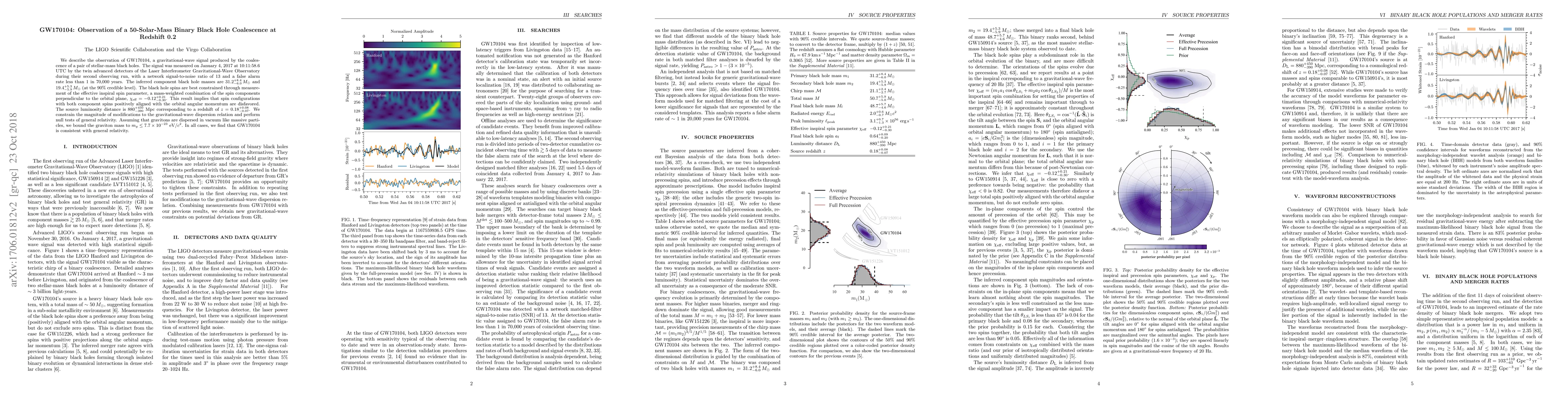 We describe the observation of GW170104, a gravitational-wave signal produced by the coalescence of a pair of stellar-mass black holes. The signal was measured on January 4, 2017 at 10:11:58.6 UTC by the twin advanced detectors of the Laser Interferometer Gravitational-Wave Observatory during their second observing run, with a network signal-to-noise ratio of 13 and a false alarm rate less than 1 in 70,000 years. The inferred component black hole masses are $31.2^{+8.4}_{-6.0}\,M_\odot$ and $19.4^{+5.3}_{-5.9}\,M_\odot$ (at the 90% credible level). The black hole spins are best constrained through measurement of the effective inspiral spin parameter, a mass-weighted combination of the spin components perpendicular to the orbital plane, $\chi_\mathrm{eff} = -0.12^{+0.21}_{-0.30}.$ This result implies that spin configurations with both component spins positively aligned with the orbital angular momentum are disfavored. The source luminosity distance is $880^{+450}_{-390}~\mathrm{Mpc}$ corresponding to a redshift of $z = 0.18^{+0.08}_{-0.07}$. We constrain the magnitude of modifications to the gravitational-wave dispersion relation and perform null tests of general relativity. Assuming that gravitons are dispersed in vacuum like massive particles, we bound the graviton mass to $m_g \le 7.7 \times 10^{-23}~\mathrm{eV}/c^2$. In all cases, we find that GW170104 is consistent with general relativity.