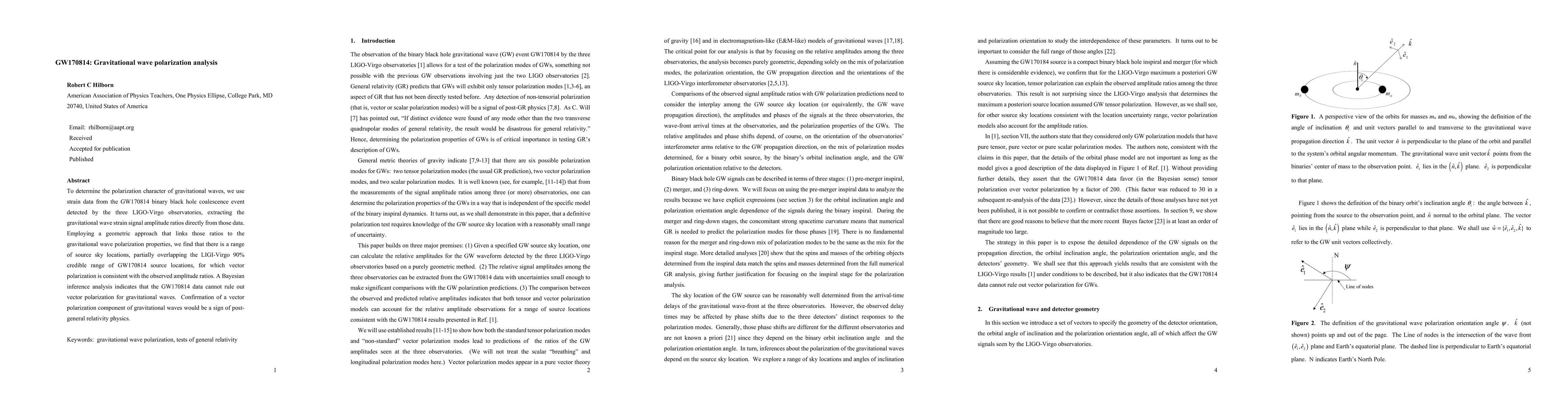 To determine the polarization character of gravitational waves, we use strain data from the GW170814 binary black hole coalescence event detected by the three LIGO-Virgo observatories, extracting the gravitational wave strain signal amplitude ratios directly from those data. Employing a geometric approach that links those ratios to the gravitational wave polarization properties, we find that there is a range of source sky locations, partially overlapping the LIGI-Virgo 90% credible range of GW170814 source locations, for which vector polarization is consistent with the observed amplitude ratios. A Bayesian inference analysis indicates that the GW170814 data cannot rule out vector polarization for gravitational waves. Confirmation of a vector polarization component of gravitational waves would be a sign of post-general relativity physics.